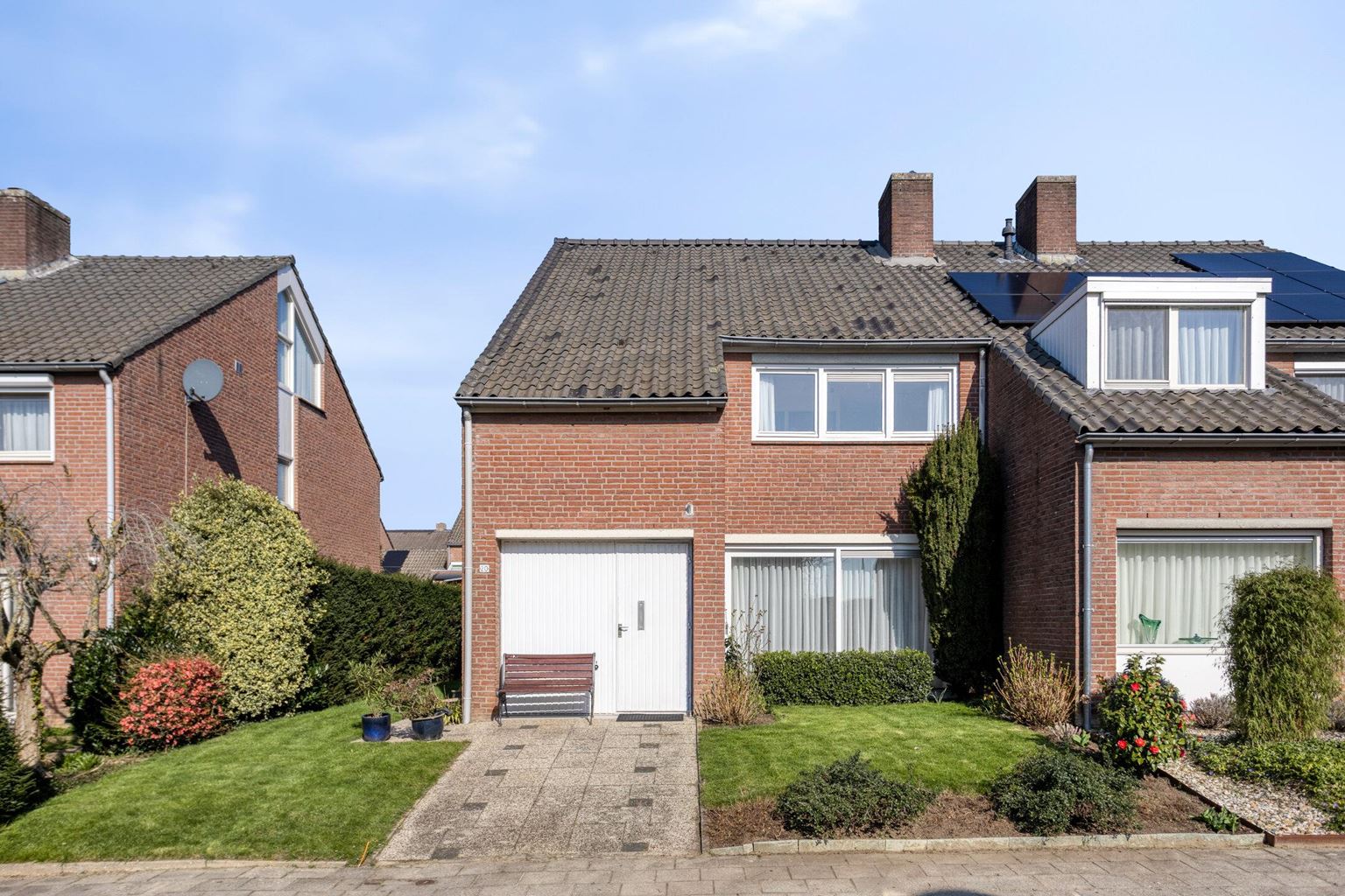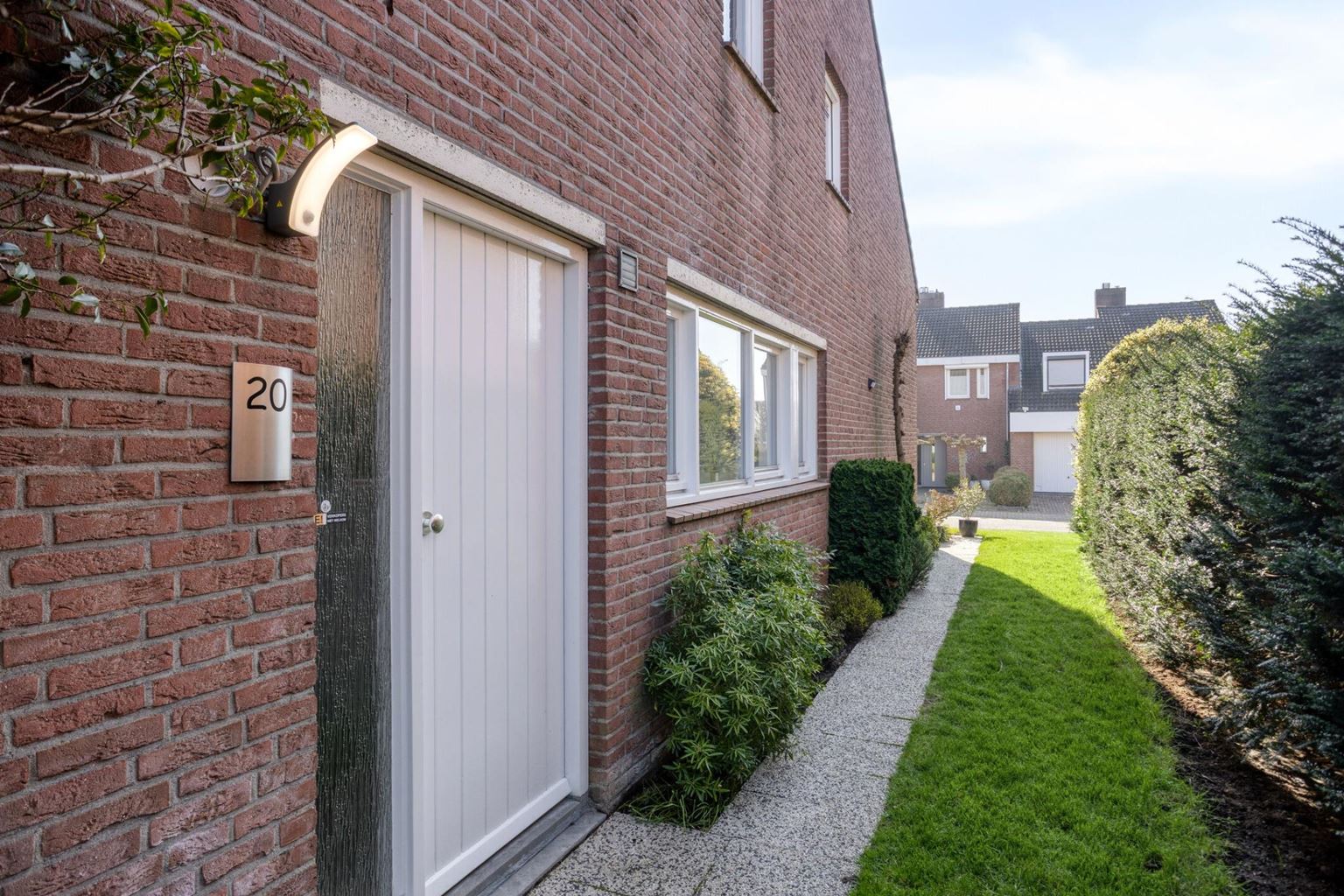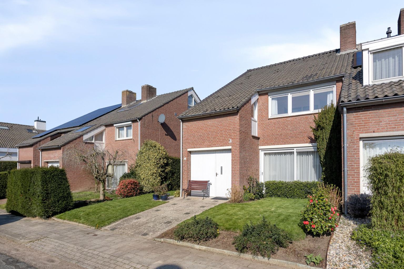 Fraai aangelegde voortuin, met gazon, hagen en beplanting en oprit voor de garage gelegen. Met toegang naar woning en achterom aan de linkerzijde via de zijtuin met looppad en gazon. De achtertuin op het noordwesten, met beklinkerd terras aansluitend aan de woning, met gazon, beplanting en leibomen.