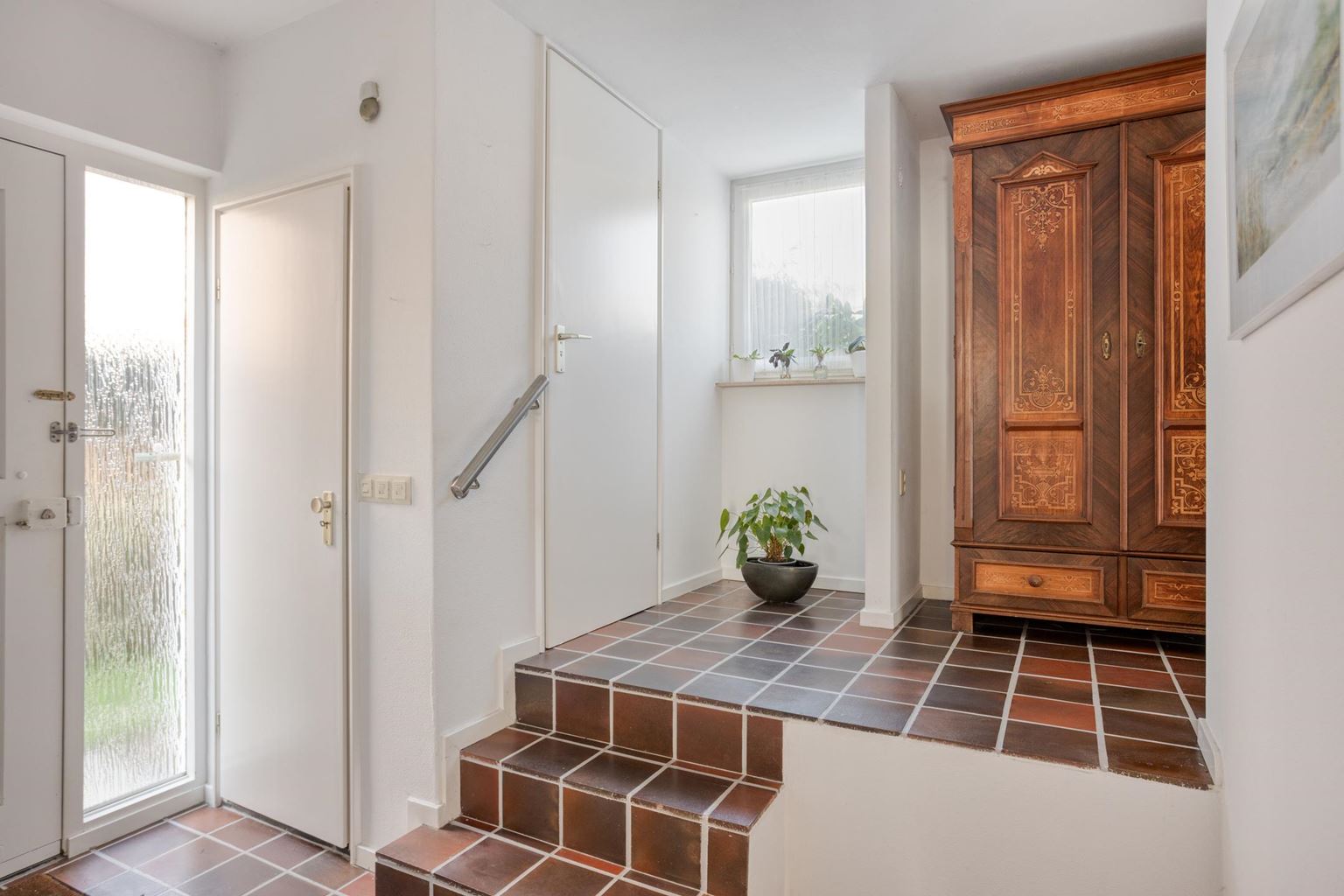 - Voordeur en toiletraampje van Meranti houten kozijnen met gehard sierglas;