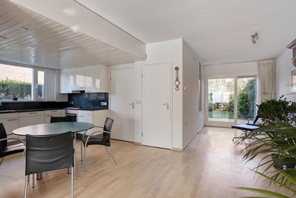 Bij binnenkomst in de woning betreedt u de entree (ca.12m²), die toegang biedt tot de keuken, de meterkast, de garderobe, het toilet en de trapopgang naar de eerste verdieping. Het geheel betegelde toilet is voorzien van een duoblok en een fonteintje. Zowel entree als het toilet zijn afgewerkt met plavuizen. De ruime woonkamer (ca.39m²) beschikt over een schuifpui met toegang tot zowel de voor- als de achtertuin, wat zorgt voor veel lichtinval en een fijne verbinding met buiten. Extra bergruimte in de trappenkast en de toegang naar de kruipruimte. De open keuken (ca.8m²) is ingericht met een praktische hoekopstelling met boven- en onderkasten en is voorzien van diverse inbouwapparatuur, waaronder een 4-pits gaskookplaat, afzuigkap, vaatwasser, combi-oven en een dubbele spoelbak. De keuken en woonkamer zijn afgewerkt met een lichte parketvloer, wat het geheel een warme en verzorgde uitstraling geeft. Vanuit de keuken bereikt u de bijkeuken (ca.4m²), waar zich de aansluitingen voor het witgoed bevinden. Inpandige garage voorzien van elektra en water (ca.14m²) bereikbaar vanuit de bijkeuken, voorzien van kantelpoort met loopdeur en brievenbus.