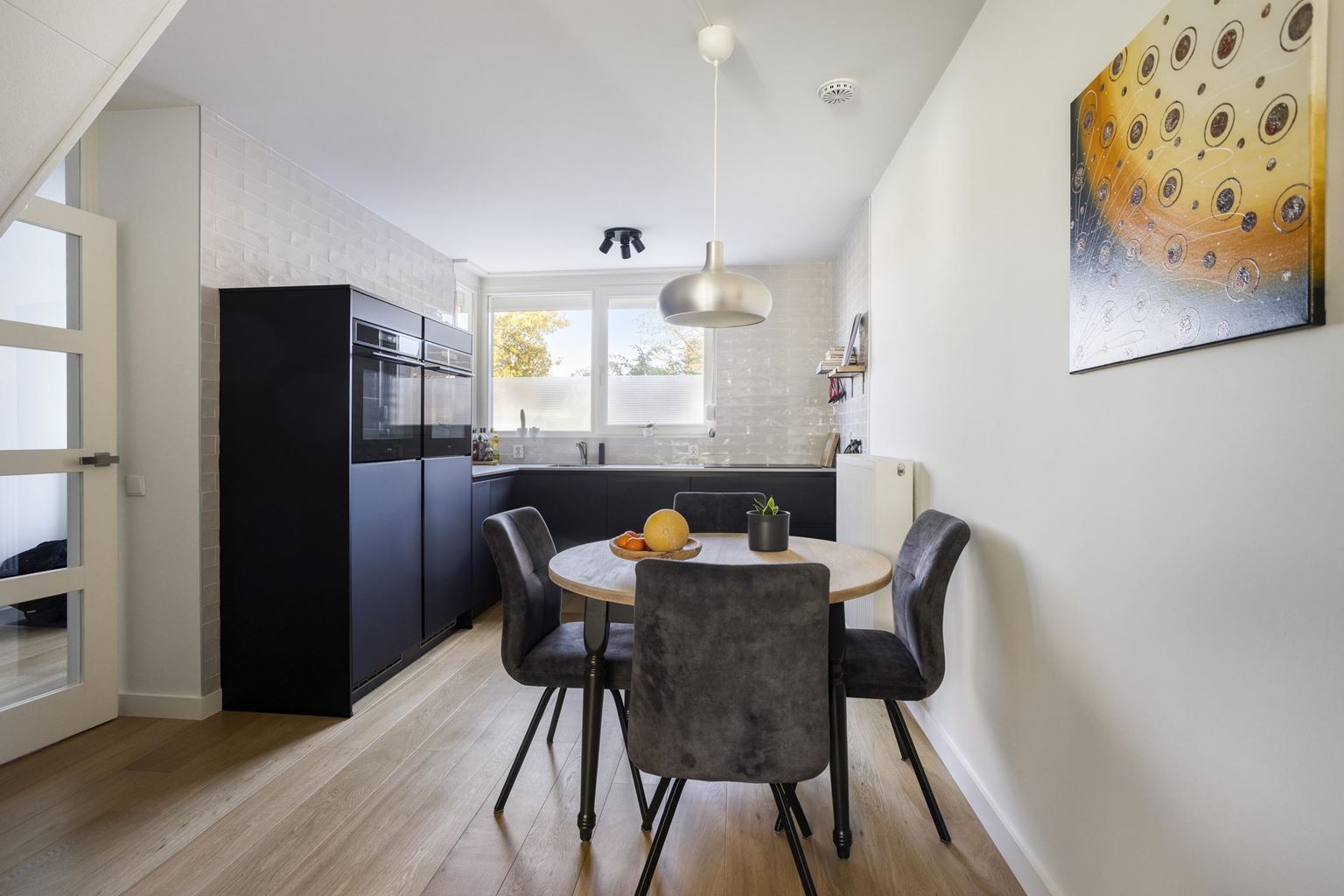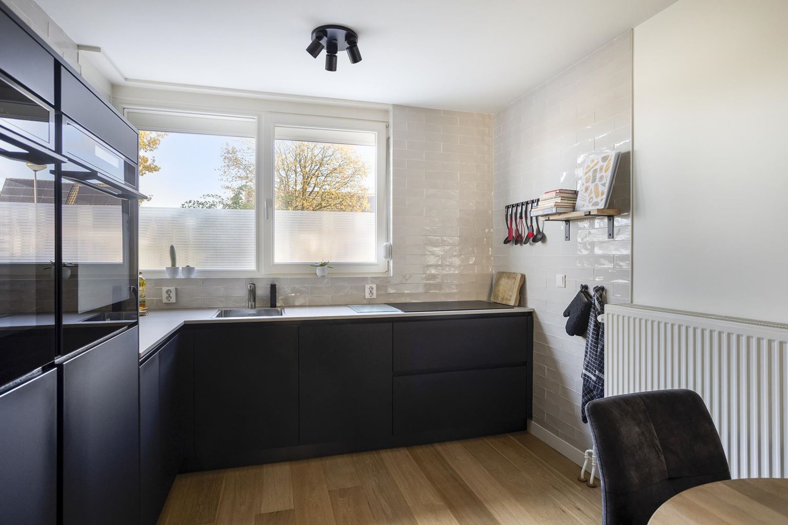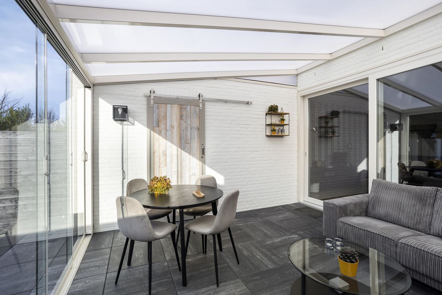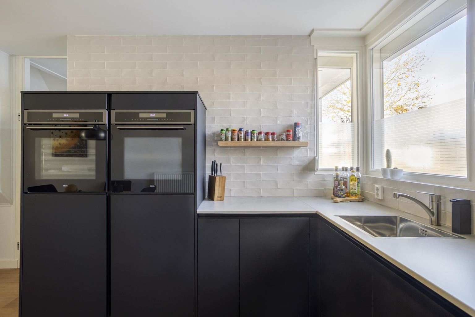 Royale hal/entree (ca.6m²), hier bevinden zich de meterkast en de toiletruimte, deze is geheel betegeld, keramische vloertegels met Portugees motief, voorzien van een zwevend toilet. Vanuit de hal betreedt men de open keuken voorzien van een zwart keukenblok in hoekopstelling met de volgende inbouwapparatuur: spoelbak, 4-pits inductiekookplaat met ingebouwde afzuiging (AEG), oven, combi-oven, vaatwasser en koelkast. Aanrechtblad in betonlook. Aansluitend de living die net als de rest van de begane grond, toilet uitgezonderd voorzien is van een wit eiken houten vloer. Aangrenzend bevindt zich aan de achterzijde de sfeervolle serre, waar je het hele jaar door kunt genieten van het buitengevoel.