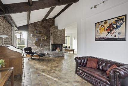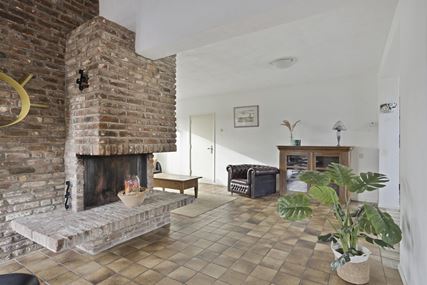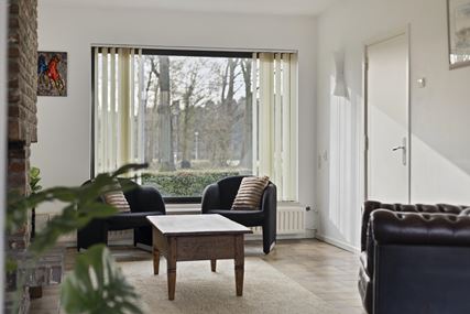 De woonkamer (61m²) vormt het hart van de woning en is opvallend ruim door twee uitbouwen: één aan de achterzijde en één aan de rechterzijde van de woning. De functionele open haard vormt een sfeervol middelpunt van de woonkamer. Het zitgedeelte bevindt zich aan de voorzijde van de woning en biedt een prettig uitzicht over de groenvoorzieningen.