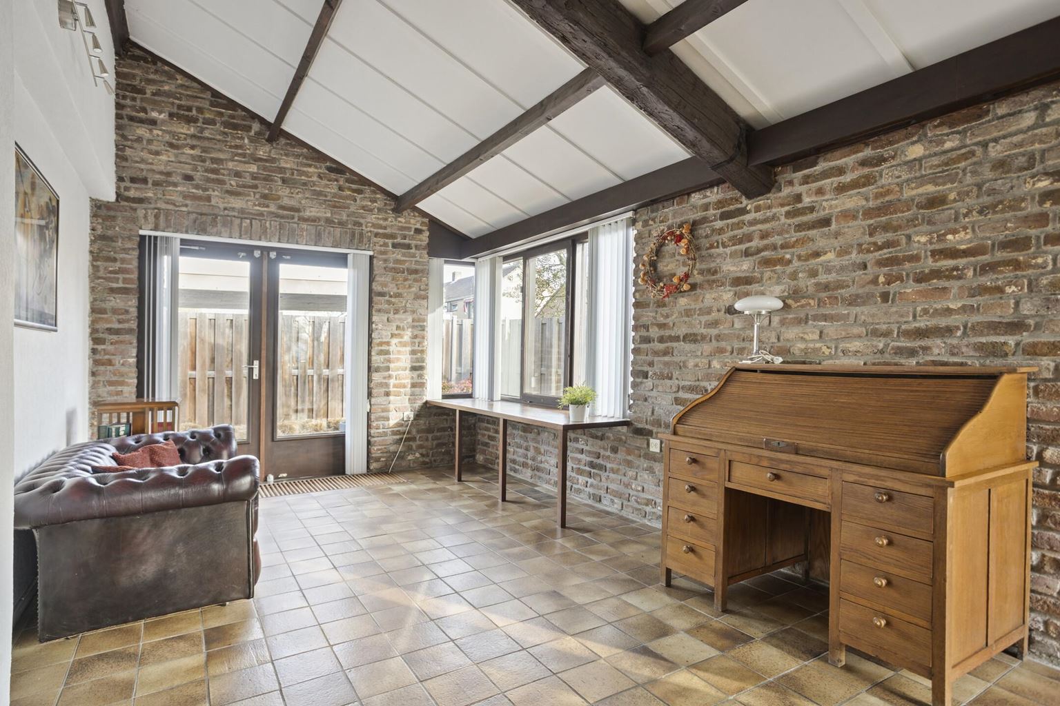 De uitbouw aan de achterzijde is momenteel ingericht als eetgedeelte en staat via openslaande deuren in directe verbinding met de tuin. De uitbouw aan de rechterzijde beschikt eveneens over dubbele openslaande deuren naar de tuin, waardoor binnen en buiten op een prettige manier in elkaar overlopen.