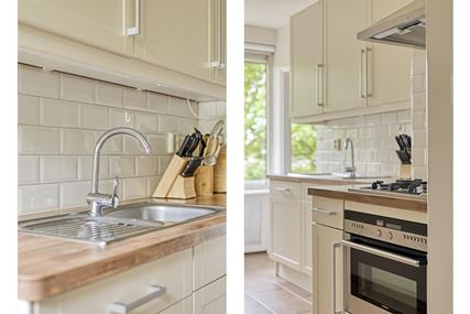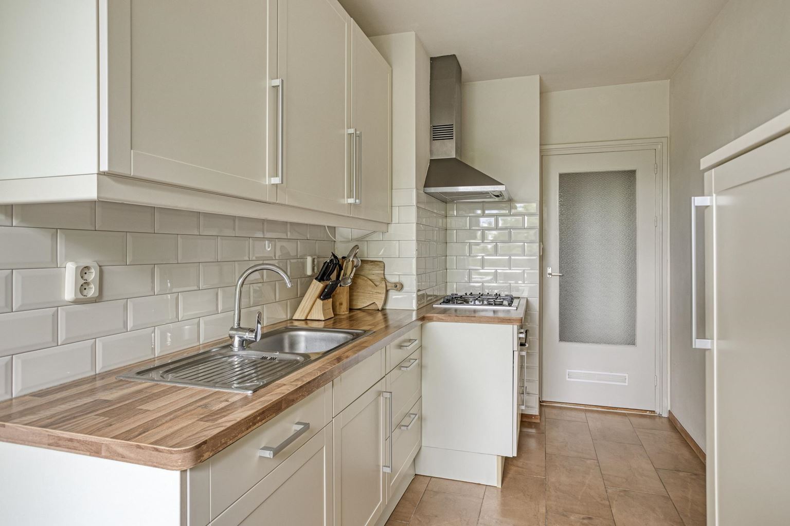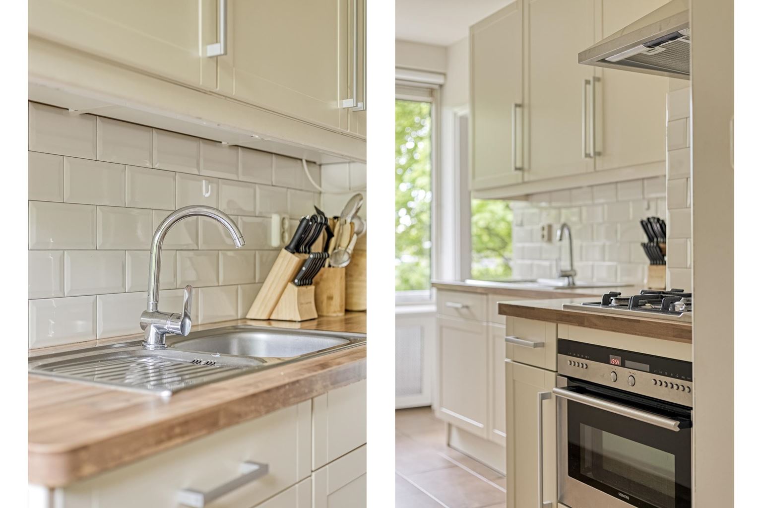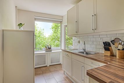 De gesloten keuken (circa 9 m²) is functioneel ingericht en voorzien van diverse (inbouw)apparatuur, waaronder een spoelbak, 4-pits gasfornuis, afzuigkap, combi-oven, koelkast met vriesvak en een recent vernieuwde vaatwasser. Vanuit de keuken bereikt u de praktische bijkeuken/wasruimte met aansluiting voor de wasmachine, de vernieuwde meterkast en toegang tot het balkon aan de voorzijde.