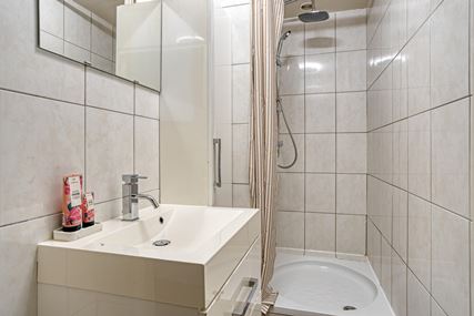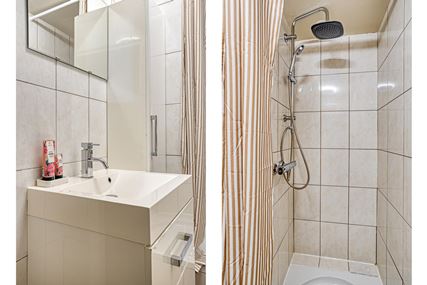 De badkamer (circa 2 m²) is compact maar functioneel en uitgerust met een douche en vaste wastafel. Daarnaast is er een separaat toilet aanwezig.