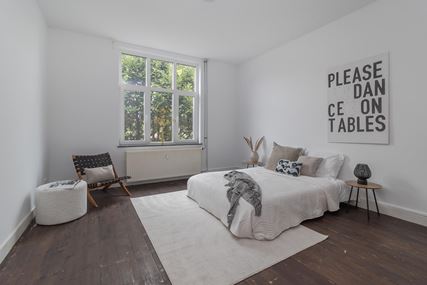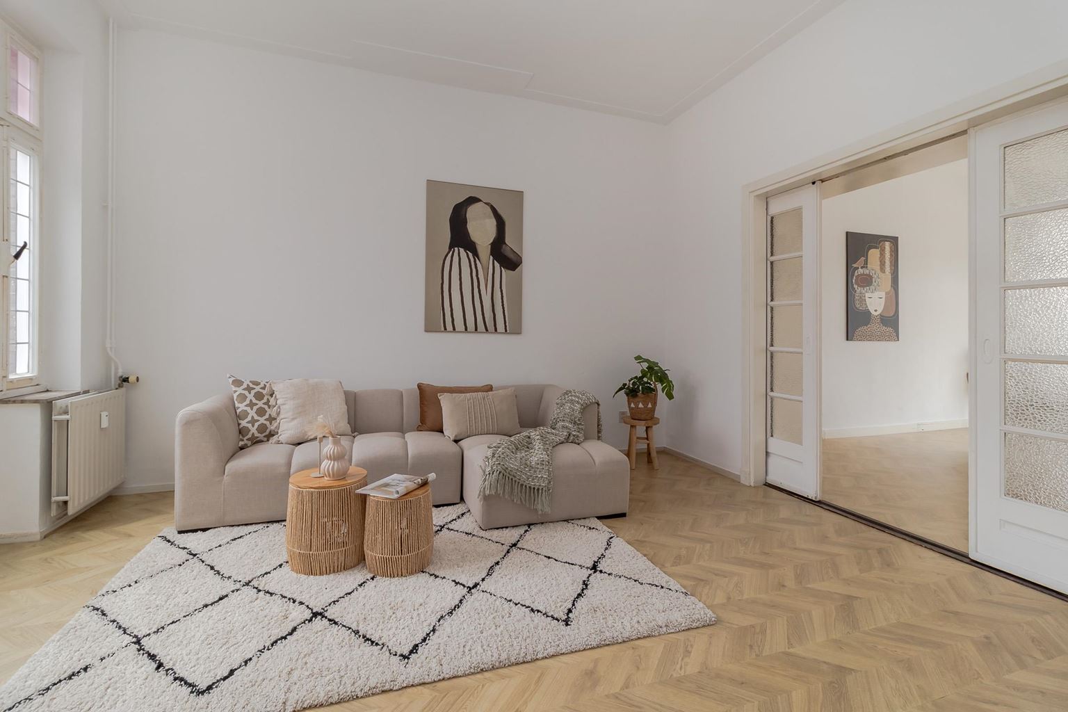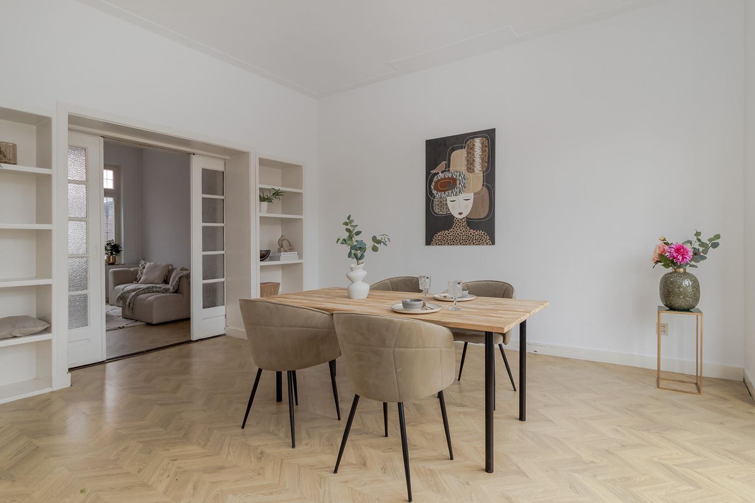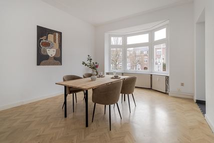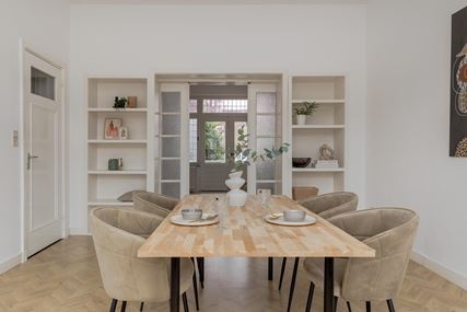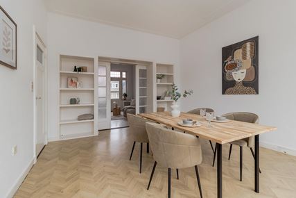 De woonkamer-en-suite (37m²) is een absolute blikvanger: een ruim en licht vertrek, voorzien van een moderne visgraat laminaatvloer en een sfeervolle erker aan de voorzijde. Aan weerszijden van de en-suite deuren bevinden zich vaste kasten die zorgen voor extra opbergruimte en het authentieke karakter van de woning benadrukken. De houten kozijnen, deels voorzien van glas-in-lood, dragen bij aan de karakteristieke en warme sfeer van de woning.