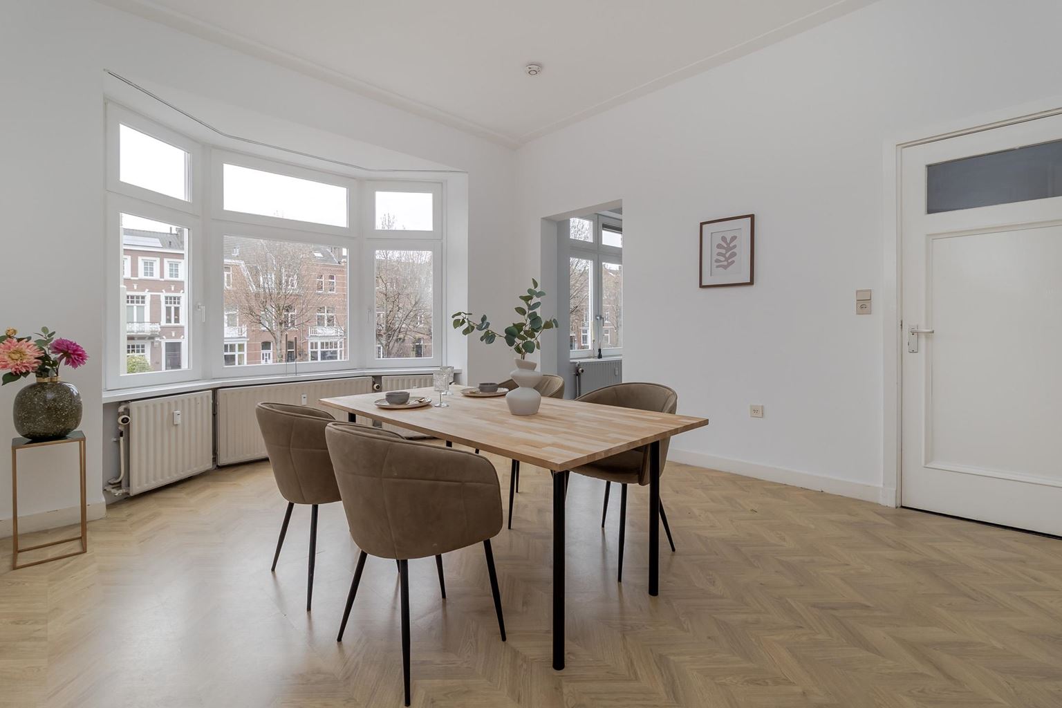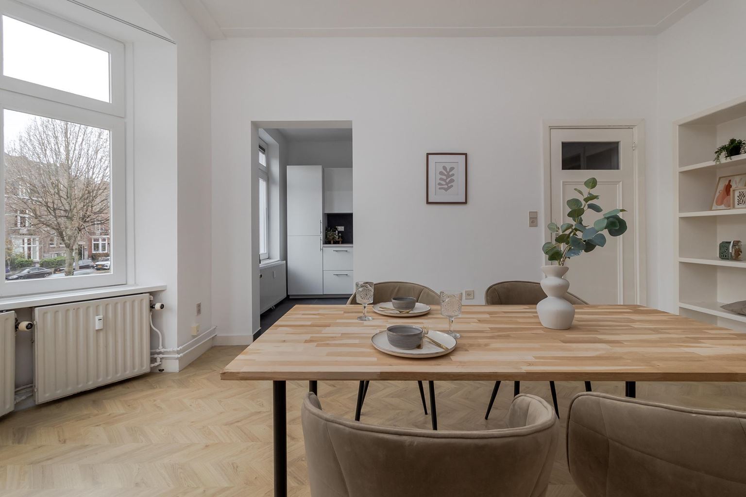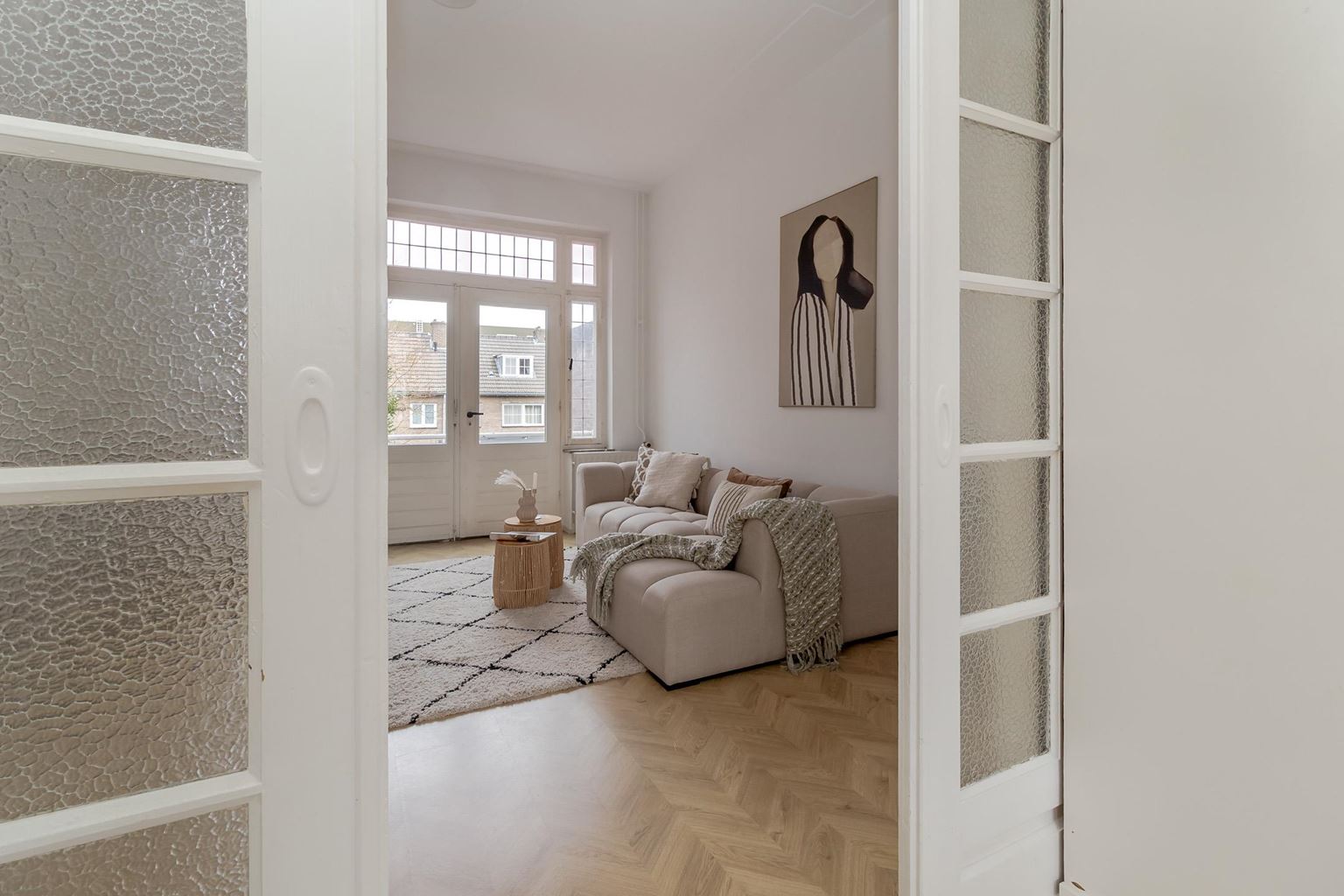 De woonkamer-en-suite (37m²) is een absolute blikvanger: een ruim en licht vertrek, voorzien van een moderne visgraat laminaatvloer en een sfeervolle erker aan de voorzijde. Aan weerszijden van de en-suite deuren bevinden zich vaste kasten die zorgen voor extra opbergruimte en het authentieke karakter van de woning benadrukken. De houten kozijnen, deels voorzien van glas-in-lood, dragen bij aan de karakteristieke en warme sfeer van de woning.