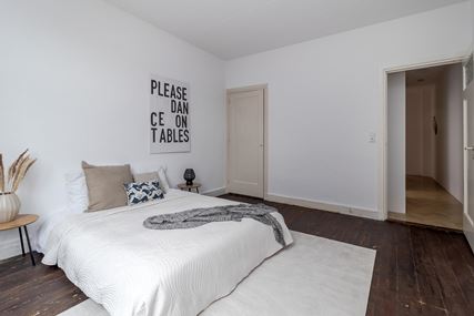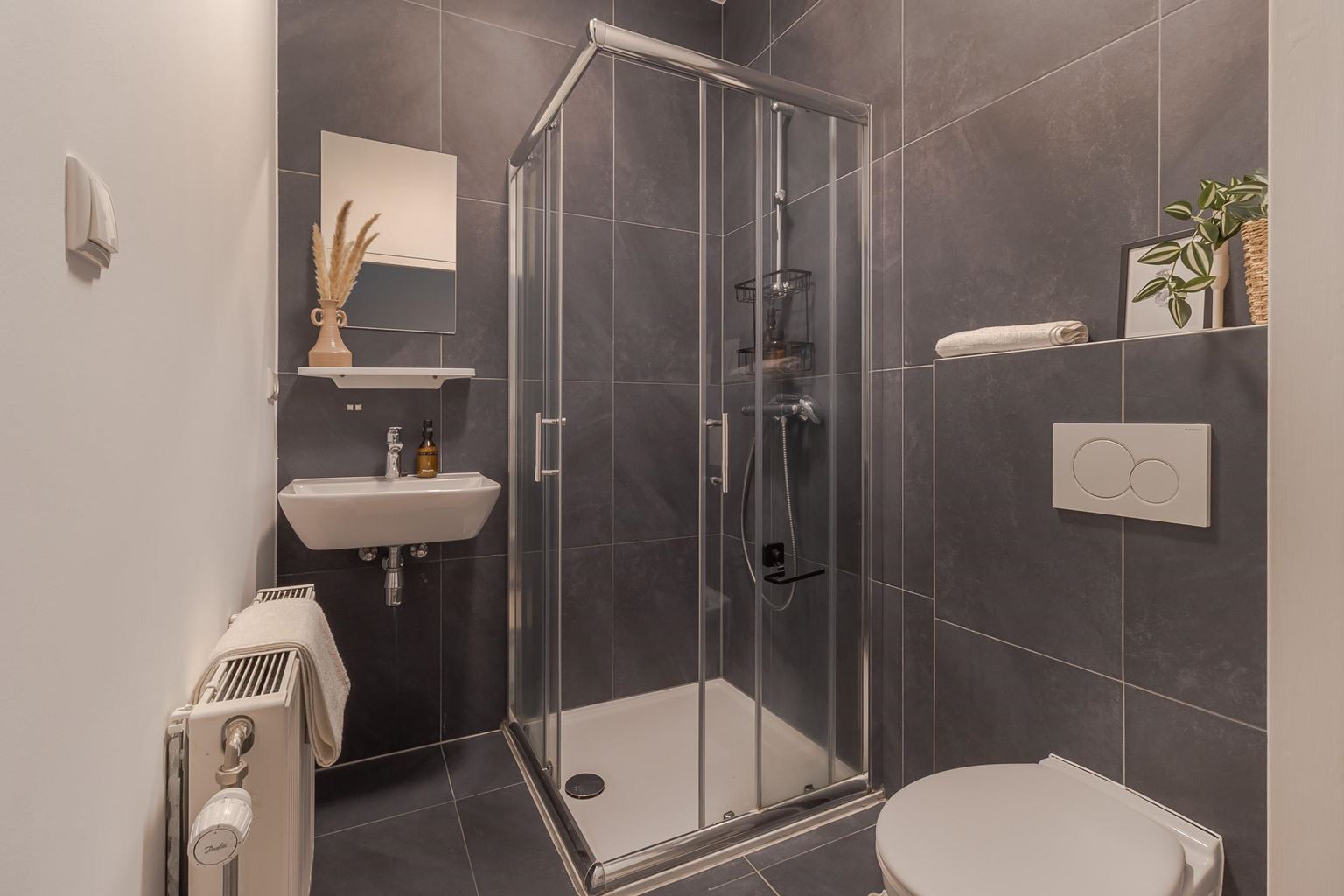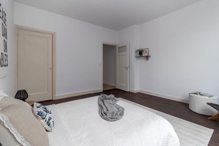 Via een tussenportaal aan de achterzijde van de woonkamer bereik je de overige vertrekken. De nette badkamer (3m²) is voorzien van een wandcloset, vaste wastafel en comfortabele inloopdouche. Daarnaast beschikt het appartement over twee volwaardige slaapkamers van respectievelijk 17m² en 8m², beide met een originele houten vloer en elk voorzien van een praktische muurkast.