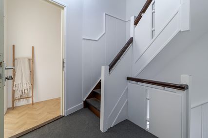 Via het gezamenlijke trappenhuis bereikt men de entree van dit mooie appartement, waarin authentieke details en hedendaags wooncomfort naadloos samenkomen. Via de nette entree kom je binnen in de hal, die toegang biedt tot de wasruimte en de royale woonkamer.