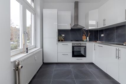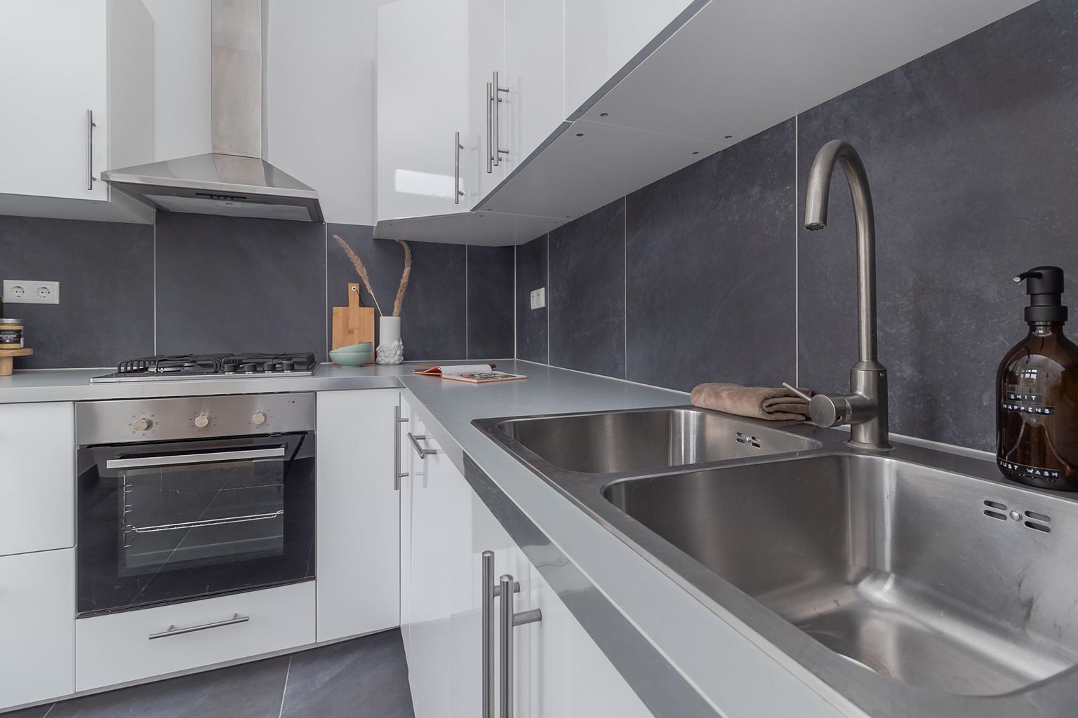 Aan de achterzijde geven openslaande deuren toegang tot het balkon (2m²), gelegen op het noordoosten. Dit is een ideale plek om 's ochtends in alle rust van het buitenleven te genieten. De woonkamer staat in directe verbinding met de semi-open keuken in hoekopstelling die aan de voorzijde gelegen is. De keuken (8m²) beschikt over een kunststof aanrechtblad, voldoende opbergruimte en is uitgerust met de volgende (inbouw)apparatuur, te weten: een 4-pits gasfornuis met afzuigkap, koelkast met vriesvak, oven, vaatwasser en een dubbele spoelbak. Ook is hier de elektrische boiler gesitueerd, die zorgt voor het warme water in de woning.