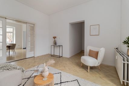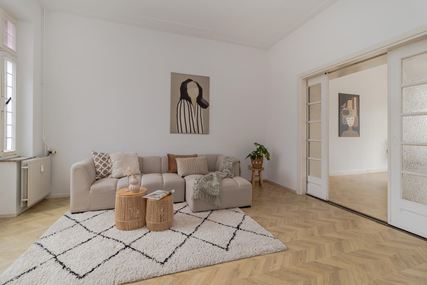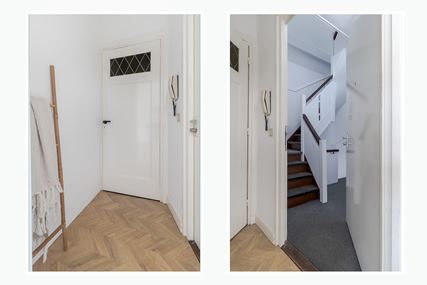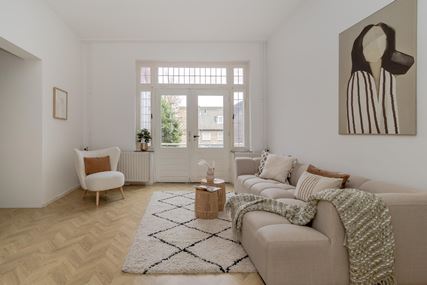 - De woonkamer is voorzien van een mooie visgraat laminaatvloer en de slaapkamers beschikken over een originele houten vloer;