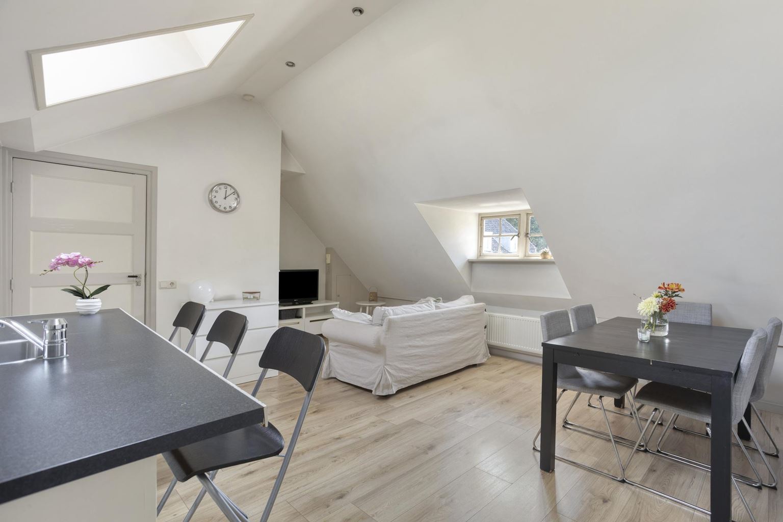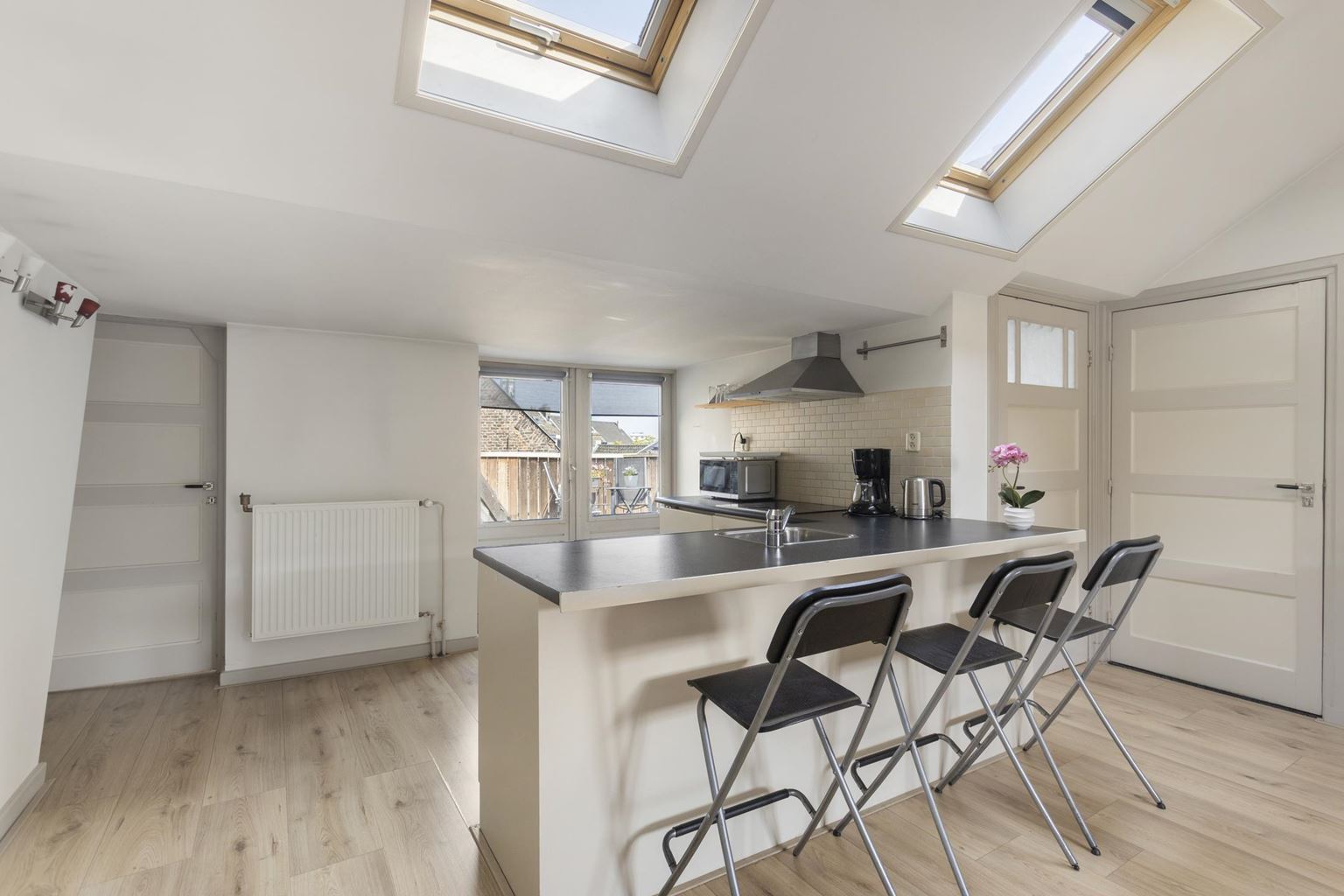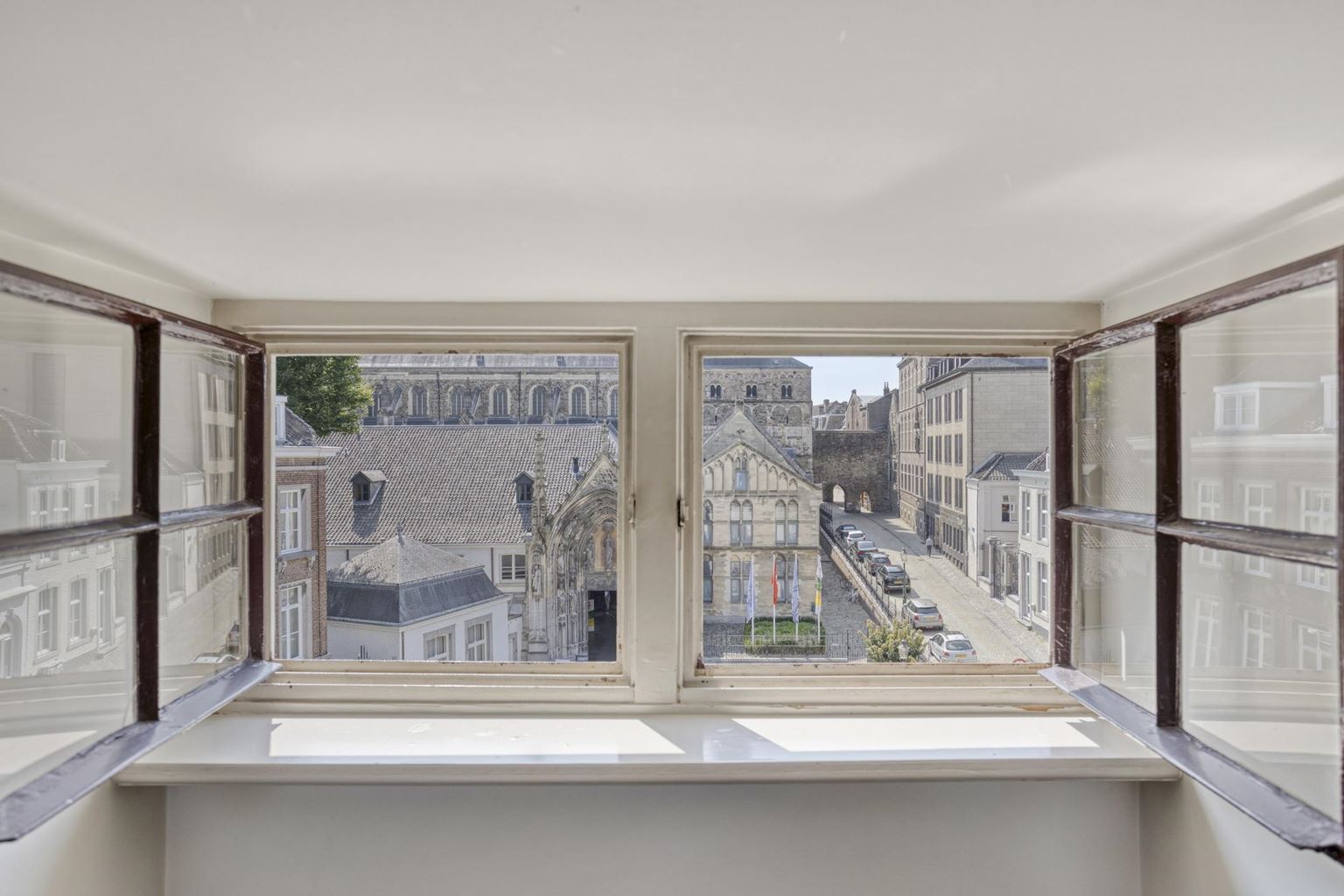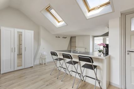 De lichte woonkamer met open keuken (totaal ca. 36,5m²) vormt het hart van het appartement. Dankzij de dakkapel aan de straatzijde en de twee Velux dakramen is er een prettige lichtinval, wat zorgt voor een ruimtelijk en open gevoel. Vanuit de woonkamer heeft u een fraai uitzicht op de Sint-Servaasbasiliek en het sfeervolle Keizer Karelplein, wat het karakter van deze plek extra onderstreept.