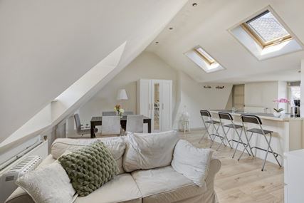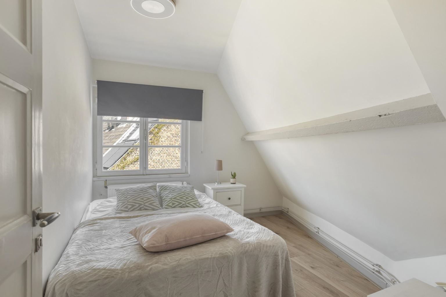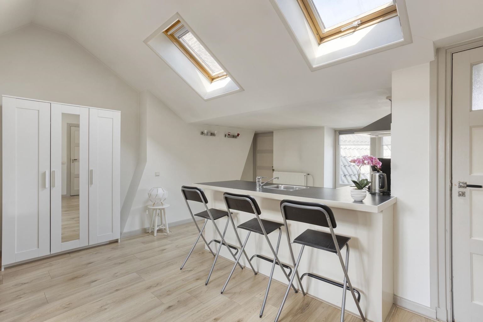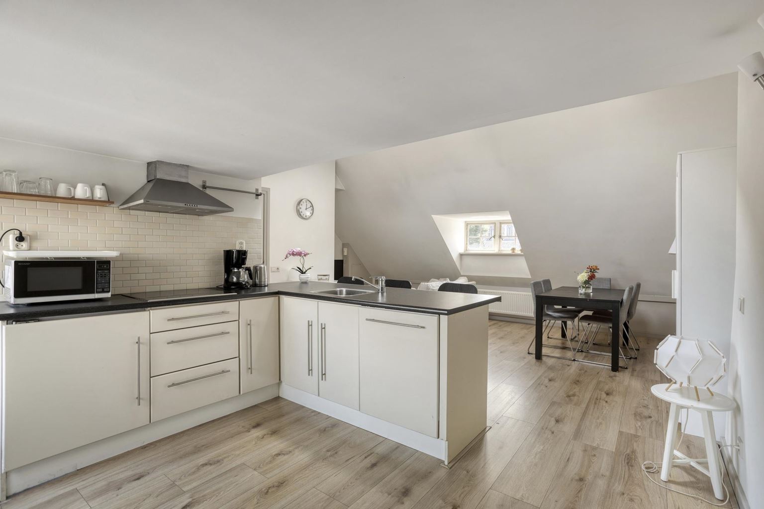 De lichte woonkamer met open keuken (totaal ca. 36,5m²) vormt het hart van het appartement. Dankzij de dakkapel aan de straatzijde en de twee Velux dakramen is er een prettige lichtinval, wat zorgt voor een ruimtelijk en open gevoel. Vanuit de woonkamer heeft u een fraai uitzicht op de Sint-Servaasbasiliek en het sfeervolle Keizer Karelplein, wat het karakter van deze plek extra onderstreept.