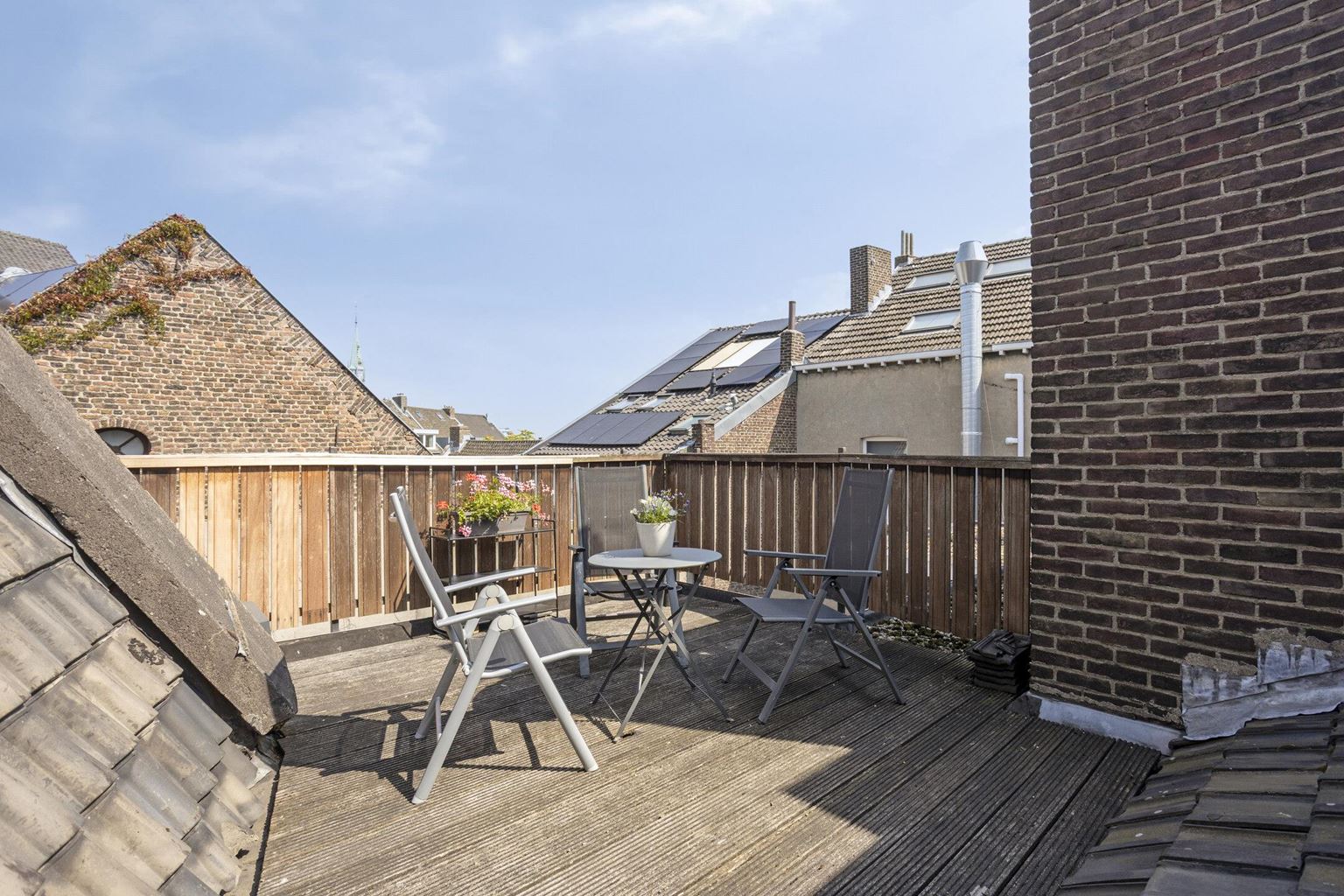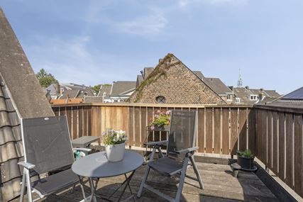 Vanuit de keuken is tevens het royale dakterras (ca. 16m²) bereikbaar. Dit terras, afgewerkt met een houten vlonder, biedt een fijne plek om buiten te zitten en te genieten van de rust en het uitzicht over de daken van de binnenstad, met zicht richting de toren van het Maastrichtse stadhuis.
