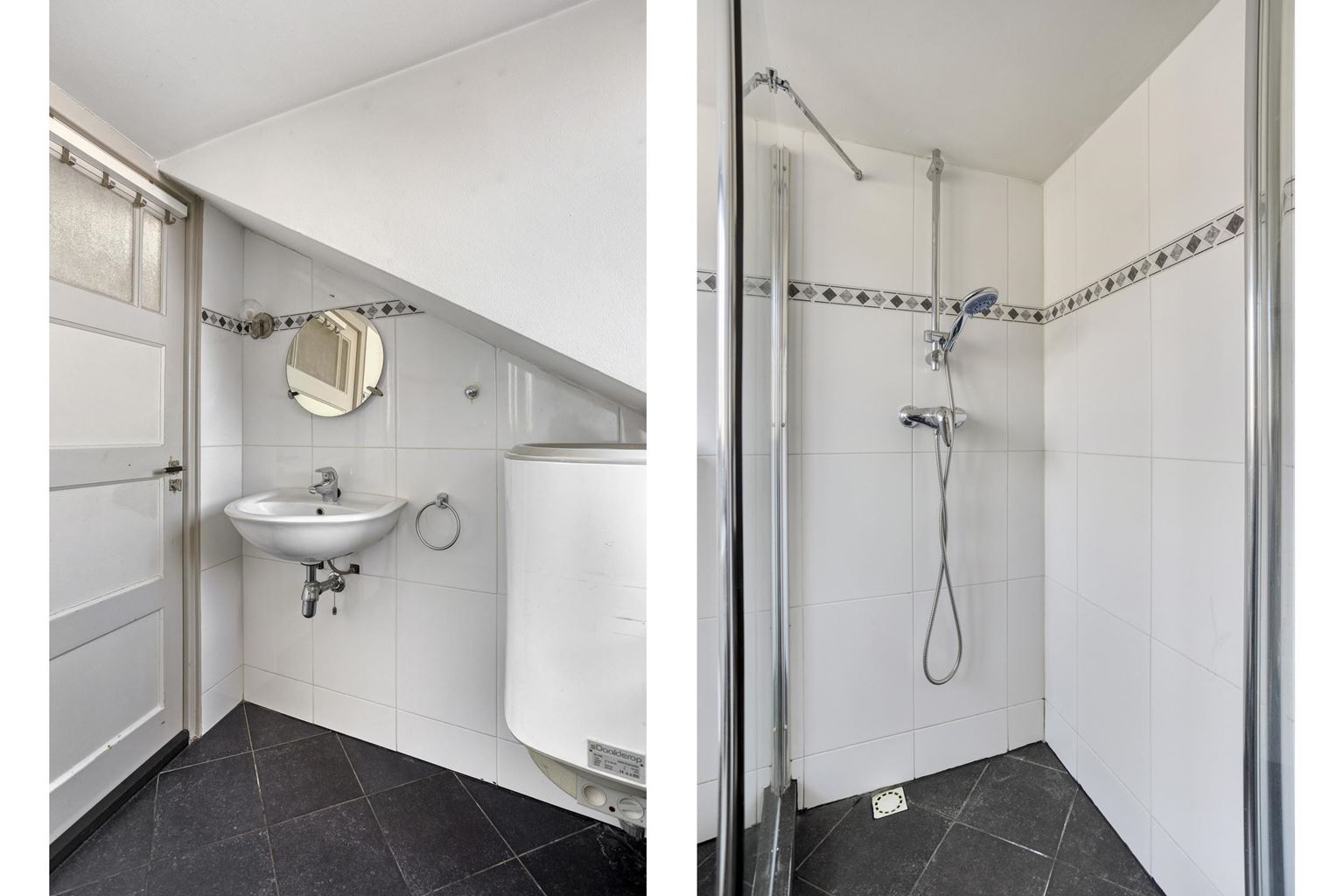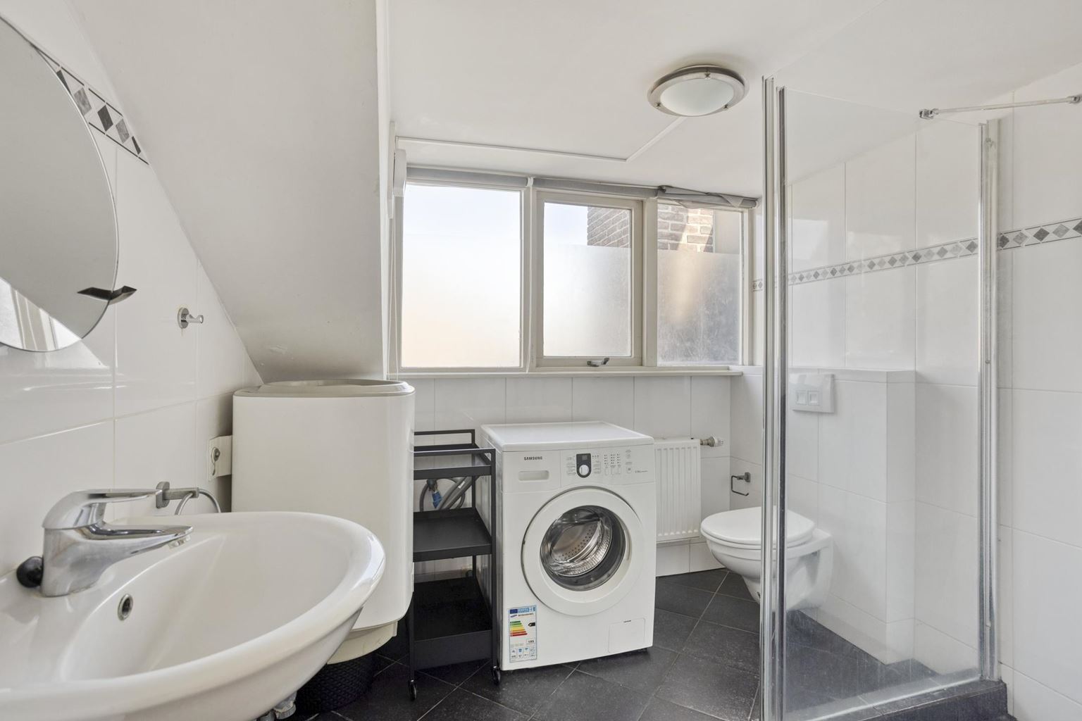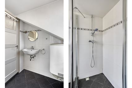 Aansluitend aan de keuken ligt de badkamer (ca. 5m²), die volledig is betegeld en beschikt over een douche, toilet en wastafel. De badkamer is verder uitgerust met de aansluiting voor de wasmachine, een radiator en de boiler voor de warmwatervoorziening.