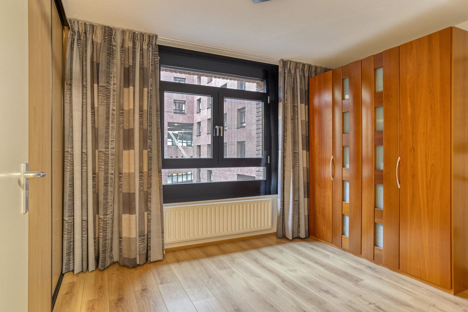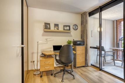 Het appartement beschikt over drie volwaardige slaapkamers. De masterbedroom (12m²) is ruim van opzet en voorzien van dezelfde eikenhouten parketvloer als in de hal en woonkamer. Slaapkamer 2 (10m²) en slaapkamer 3 (7m²) zijn afgewerkt met een nette laminaatvloer en beschikken over praktische inbouwkasten. De kleinste slaapkamer is momenteel in gebruik als kantoorruimte en biedt via openslaande deuren toegang tot de loggia (6m²) met uitzicht op de binnentuin.