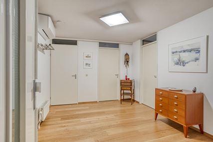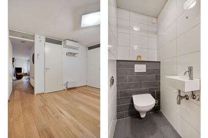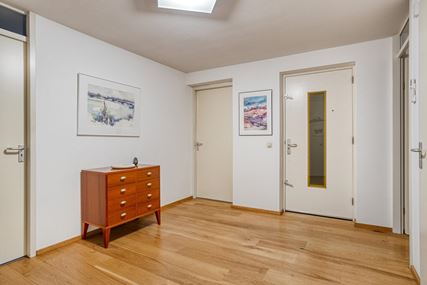 Bij binnenkomst in dit goed onderhouden appartement betreedt u een royale ontvangsthal van circa 13m². De hal is voorzien van een airco en biedt toegang tot alle vertrekken van de woning. Tevens bevindt zich hier een moderne toiletruimte, uitgerust met een wandcloset en een fonteintje. De hal is afgewerkt met een hoogwaardige eikenhouten parketvloer die naadloos doorloopt in de woonkamer, wat zorgt voor een warme uitstraling.