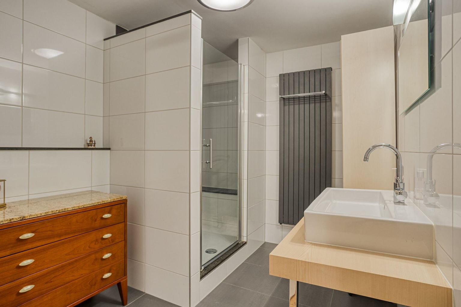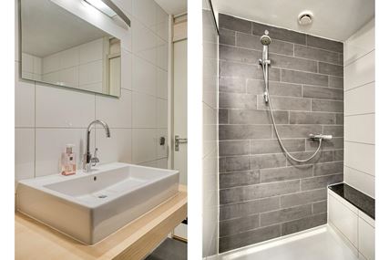 De moderne en volledig betegelde badkamer (7m²) is luxe uitgevoerd met een royale inloopdouche en een wastafel met bijbehorend meubel.