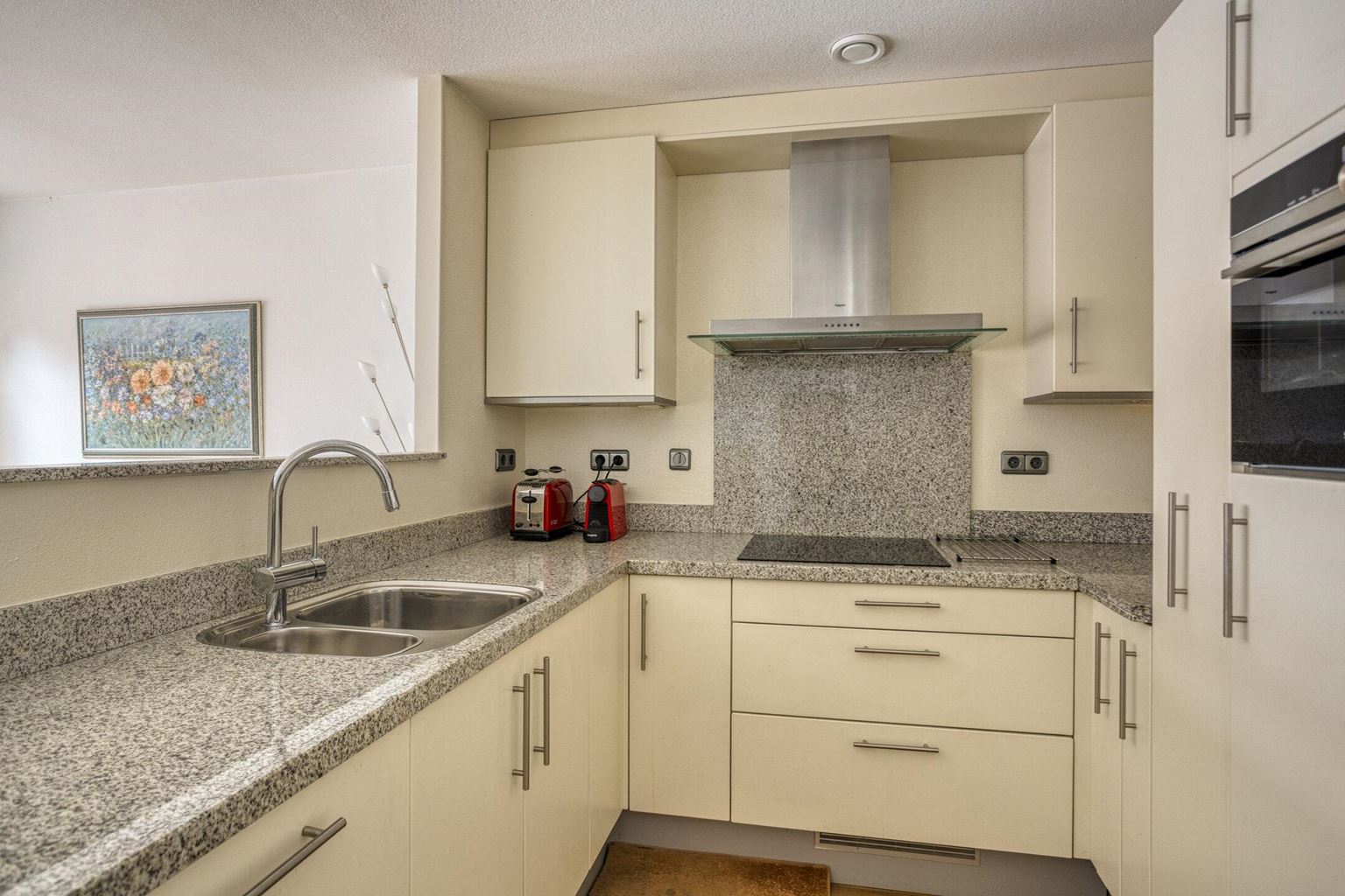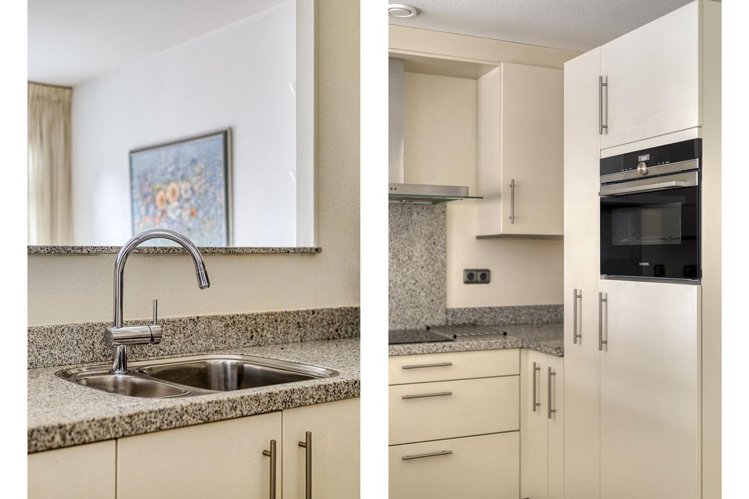 De open keuken (7m²) in u-opstelling met granieten aanrechtblad is van alle gemakken voorzien en beschikt over de volgende (inbouw)apparatuur, te weten: 4-pits inductiekookplaat met afzuigkap, combioven, vaatwasser, koelkast, dubbele spoelbak en een handige apothekerskast.