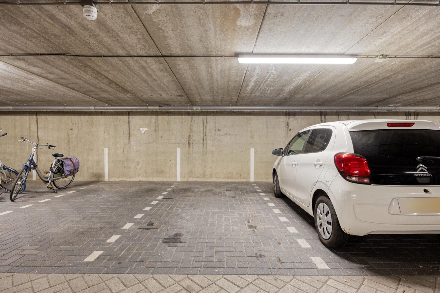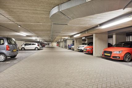 Privé parkeerplaats (nummer 62) in onderliggende parkeergarage met toegangsbeveiliging en automatische deuren, welke toegang geven tot de lift en de bergruimtes. Hier bevindt zich ook de containerruimte voor het afval. De privéberging (ca. 6,5m²) biedt voldoende mogelijkheden voor opslag van spullen en/of het plaatsen van fietsen.