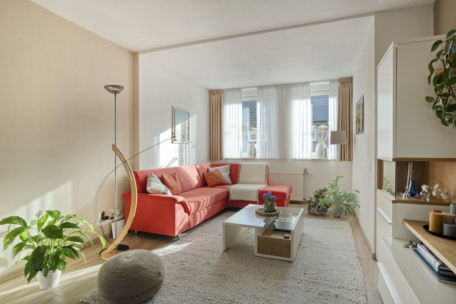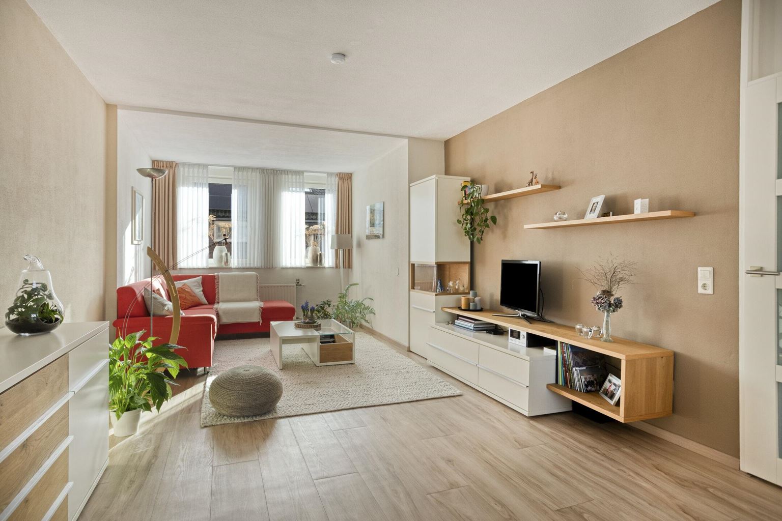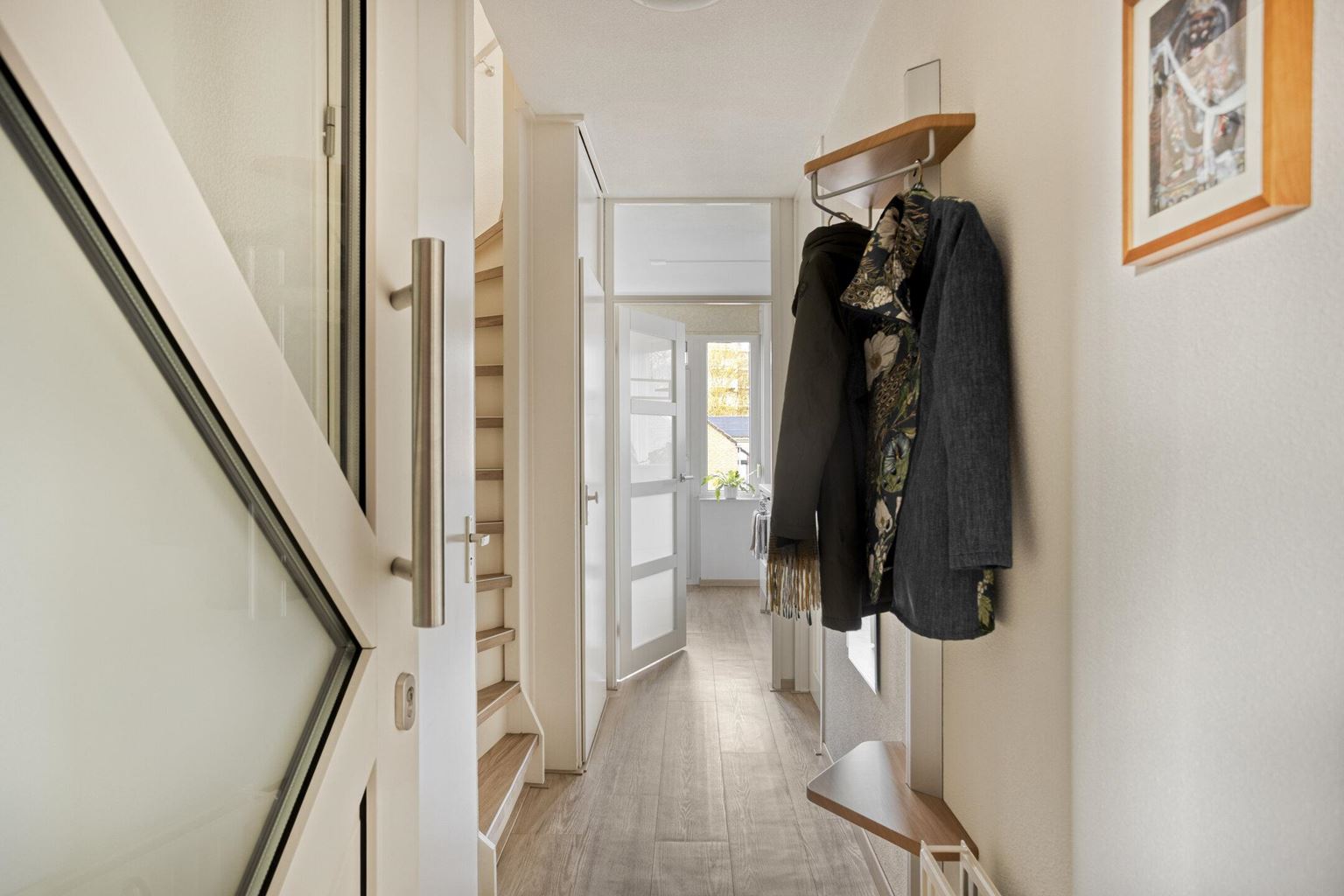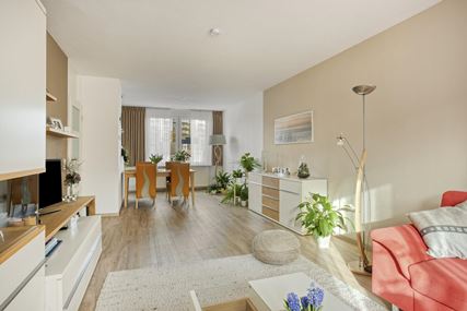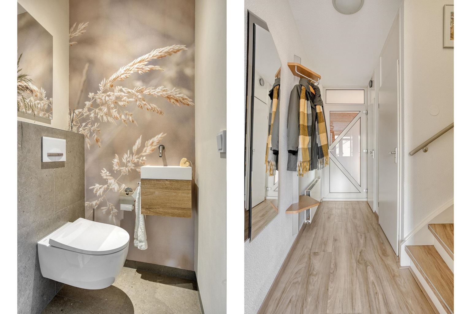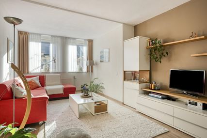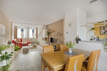 Entree/hal met toegang tot de meterkast, een praktische muurkast en de toiletruimte. Het toilet is in 2022 vernieuwd en modern uitgevoerd met een wandcloset en een fonteintje. Vanuit de hal betreedt u de lichte woonkamer met open keuken. De woonruimte (33m²) is afgewerkt met een PVC-vloer en profiteert van veel natuurlijk daglicht dankzij de grote raampartijen aan zowel de voor- als achterzijde van de woning. Dit zorgt voor een prettige en ruimtelijke sfeer.