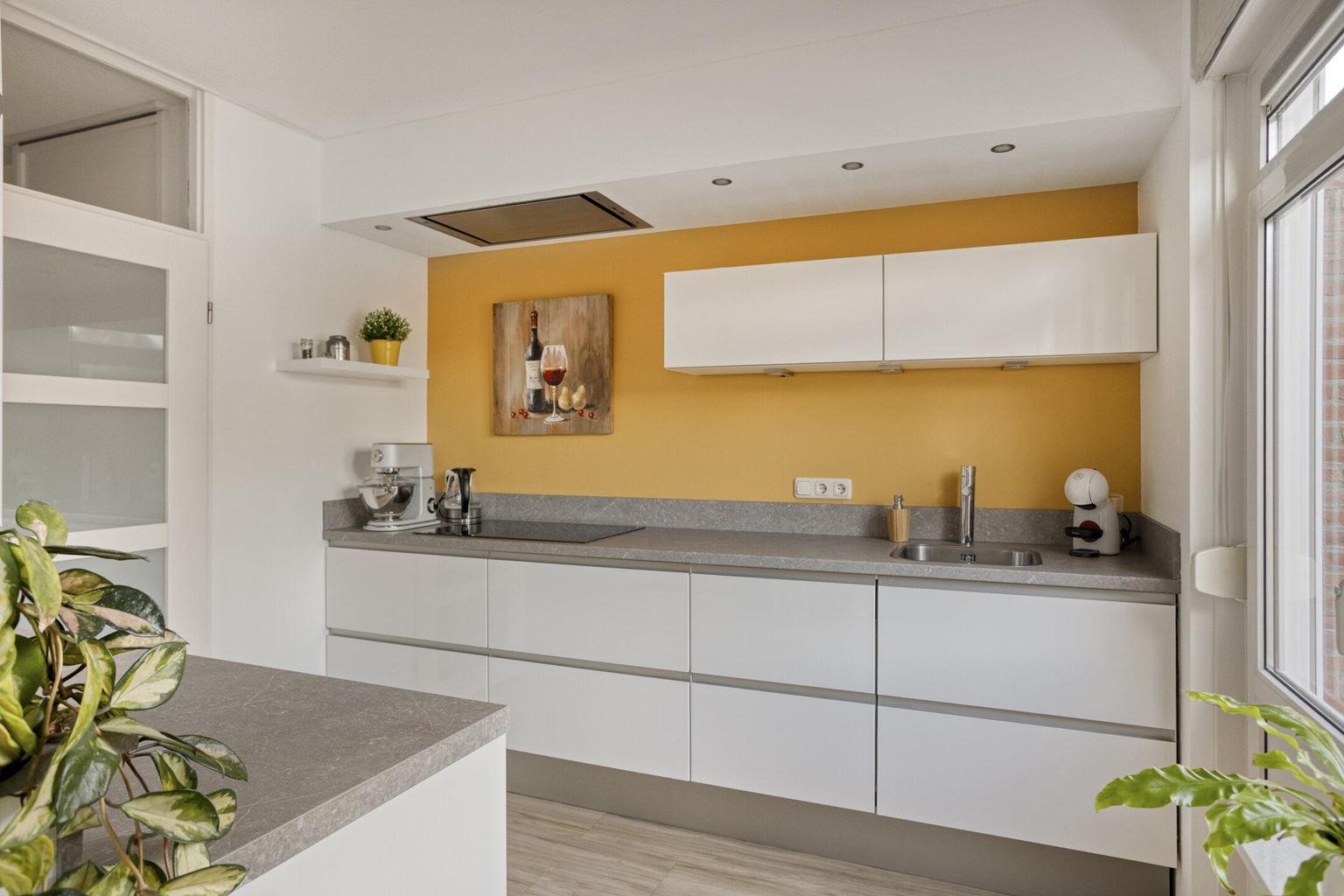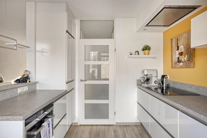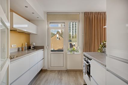 Aan de achterzijde bevindt zich de open keuken, die via openslaande deuren toegang biedt tot het balkon. De moderne keuken (8m²) is opgesteld in rij opstelling met een praktisch schiereiland en beschikt over diverse (inbouw)apparatuur, waaronder een combimagnetron, een Boretti vaatwasser, een koelkast, een vriezer met drie laden, een spoelbak en een 4-pits keramische kookplaat met afzuigkap. Het geheel is afgewerkt met een kunststof aanrechtblad, wat zorgt voor een nette en onderhoudsvriendelijke uitstraling.
