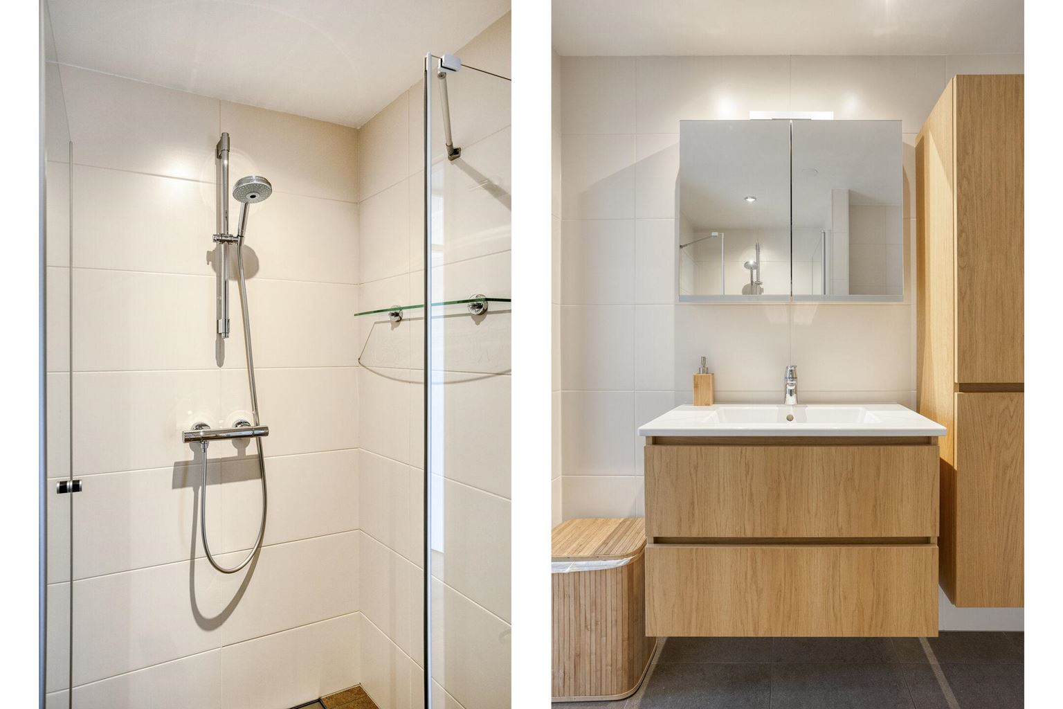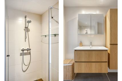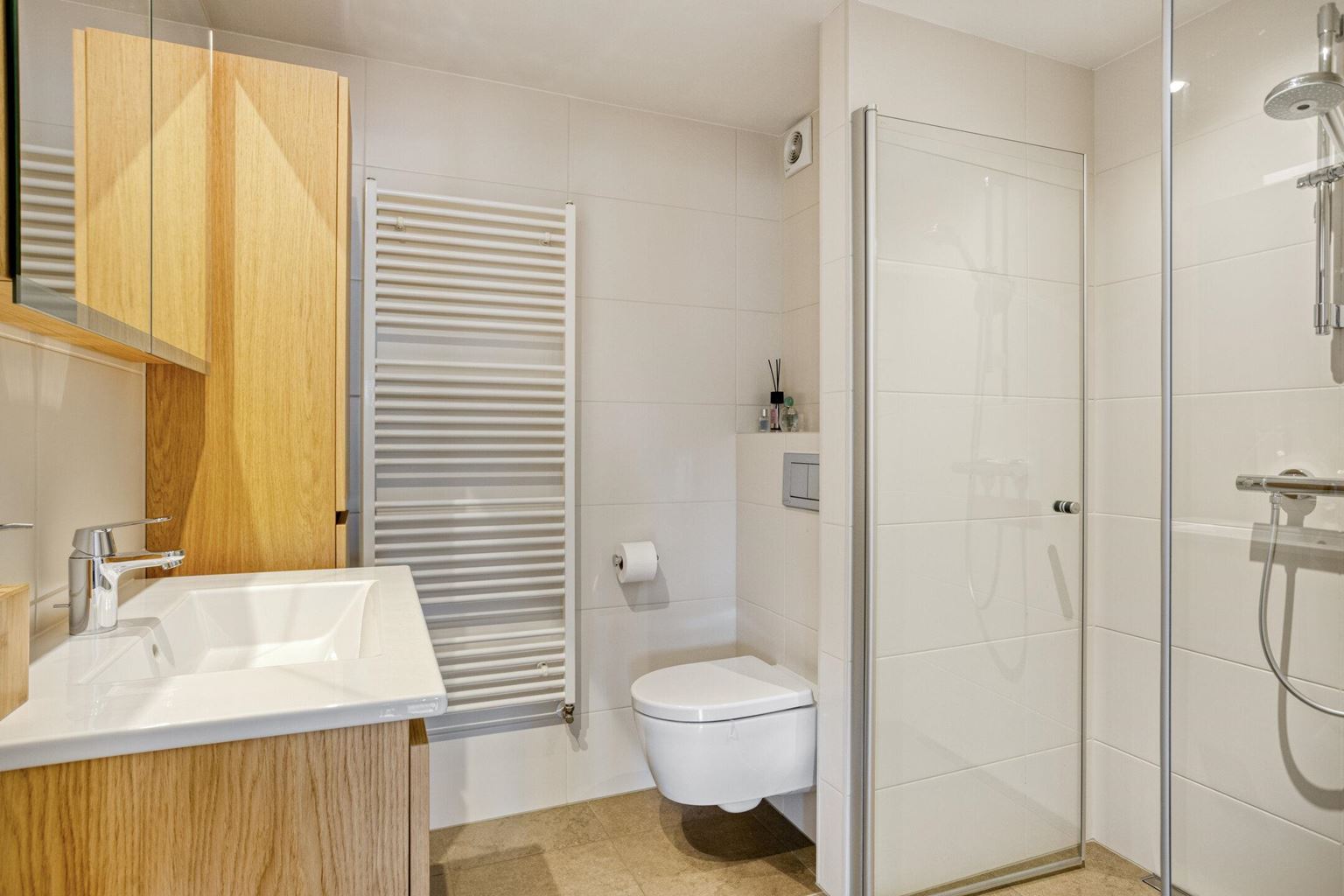 De moderne badkamer (4m²) is volledig betegeld en praktisch ingedeeld. De ruimte is uitgerust met een ruime inloopdouche, een wandcloset en een vaste wastafel met stijlvol ombouwmeubel. Tevens is de badkamer voorzien van mechanische ventilatie
