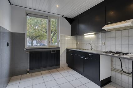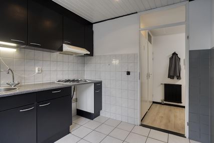 Aan de voorzijde van de woning bevindt zich de gesloten keuken (7m²), voorzien van een kunststof aanrechtblad, 4-pits gasfornuis met afzuigkap, spoelbak en een onderhoudsvriendelijke tegelvloer.