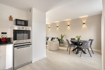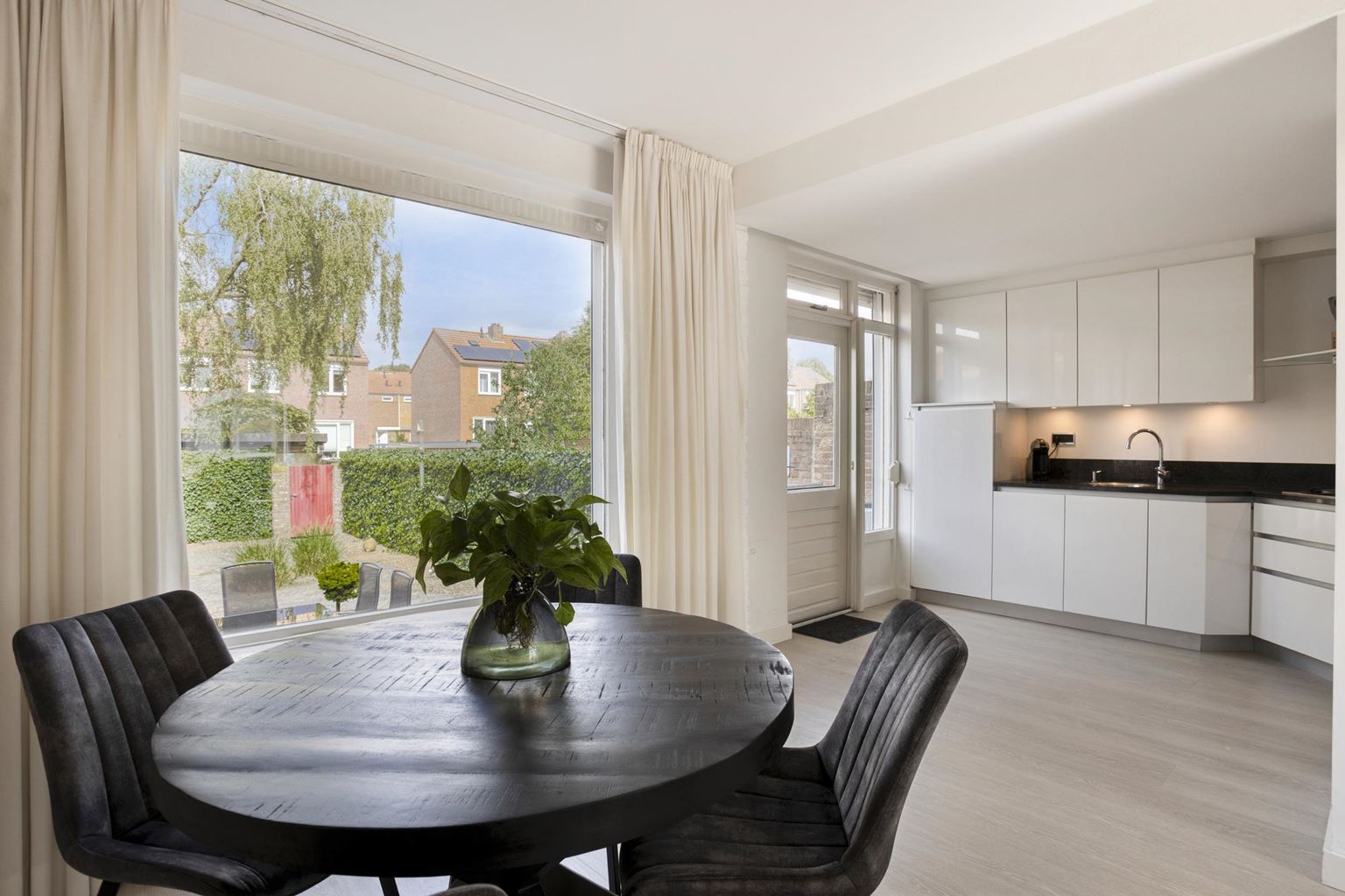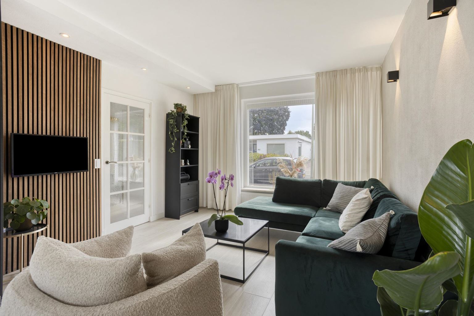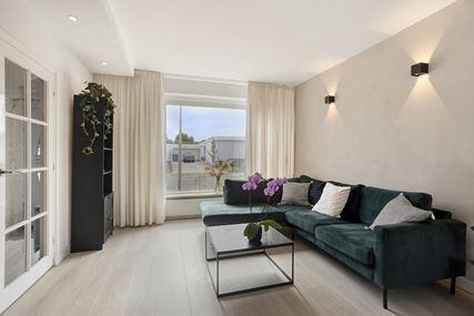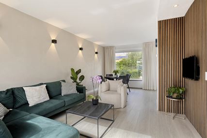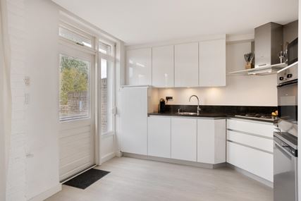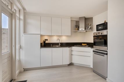 De doorzonwoonkamer (24m²) biedt een aangename leefruimte met volop lichtinval dankzij de grote raampartijen. Aansluitend bevindt zich de open keuken (6m²), welke is opgesteld in een praktische hoekopstelling. Deze keuken is voorzien van een granieten aanrechtblad en beschikt over diverse inbouwapparatuur te weten: een 4-pits gasfornuis met afzuigkap, vaatwasser, oven, koelkast met vriesvak en een spoelbak. Vanuit de keuken is er via een openslaande deur toegang tot de lager gelegen tuin.
