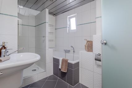 De badkamer (6m²) is compleet uitgerust met een ligbad, een afzonderlijke douche, een vaste wastafel en een tweede wandcloset. Dankzij het aanwezige raam profiteert de ruimte van natuurlijke daglichttoetreding. De badkamer is netjes onderhouden en functioneel ingericht.