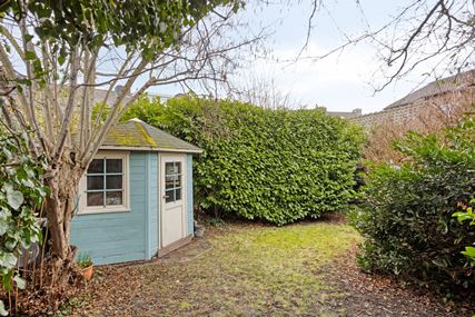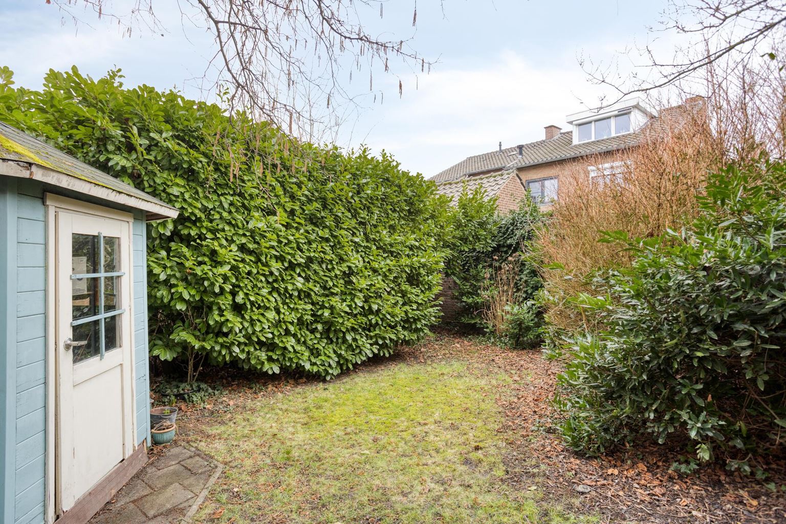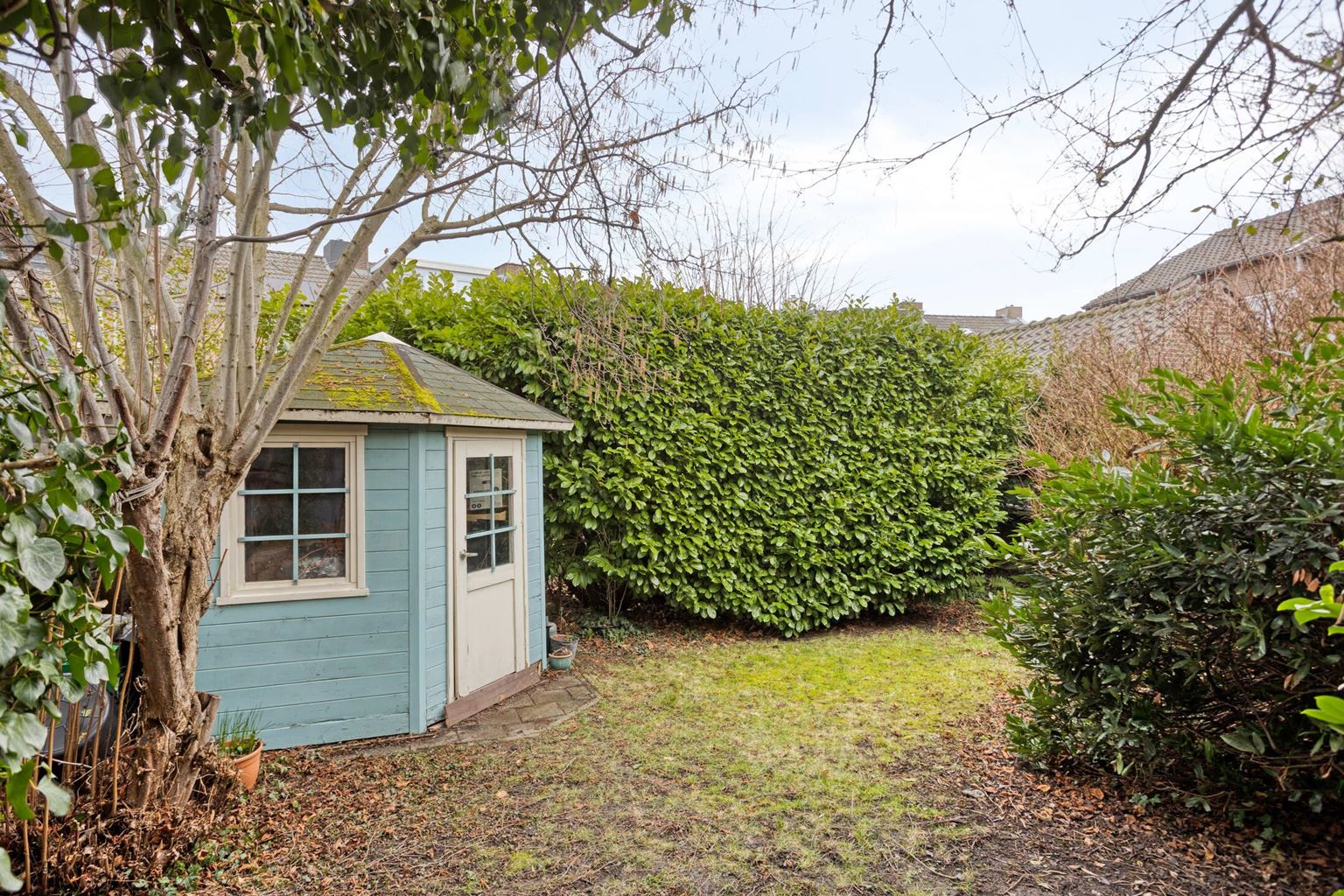 De tuin beschikt tevens over een praktische buitenberging (5m²), ideaal voor het opbergen van tuinmeubilair en gereedschap.