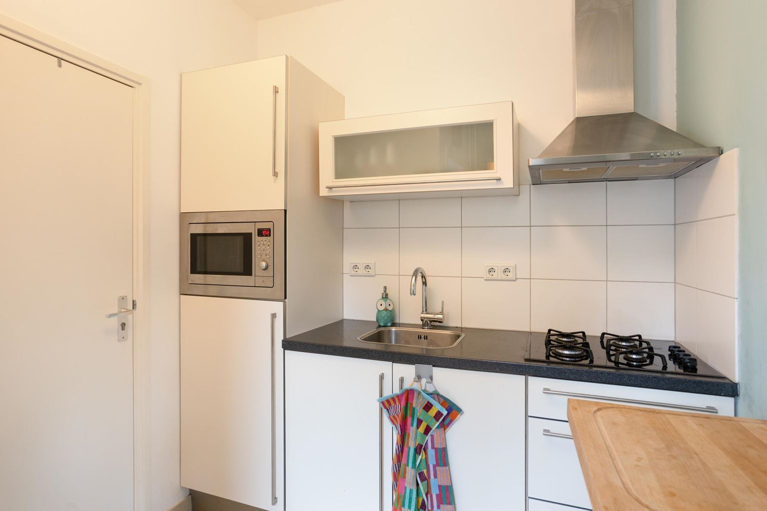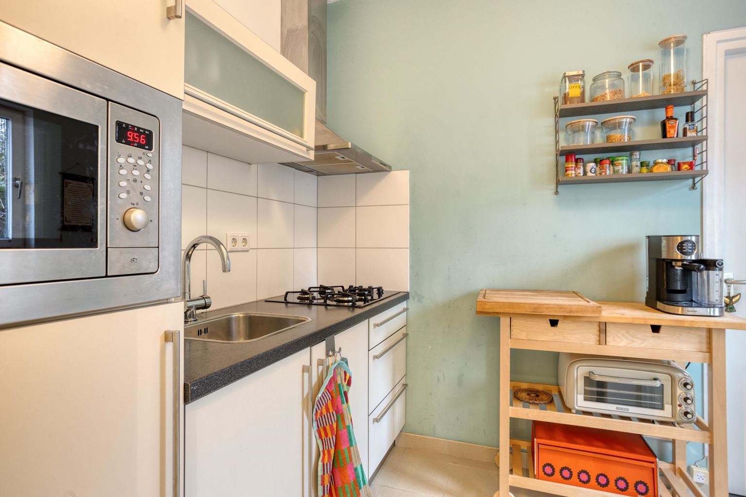 Bij binnenkomst in de hal heeft u toegang tot het separate toilet. Hier bevindt zich tevens de opstelling van de cv-installatie en praktische kastruimte. Vanuit de hal loopt u door naar de keuken (6m²), die functioneel is ingericht en is voorzien van diverse inbouw- en losse apparatuur, waaronder een koelkast met vriesvak, een 4-pits gasfornuis, een afzuigkap, een magnetron met grillfunctie en een spoelbak. Daarnaast beschikt de keuken over zowel onder- als bovenkasten, waardoor er voldoende bergruimte aanwezig is.