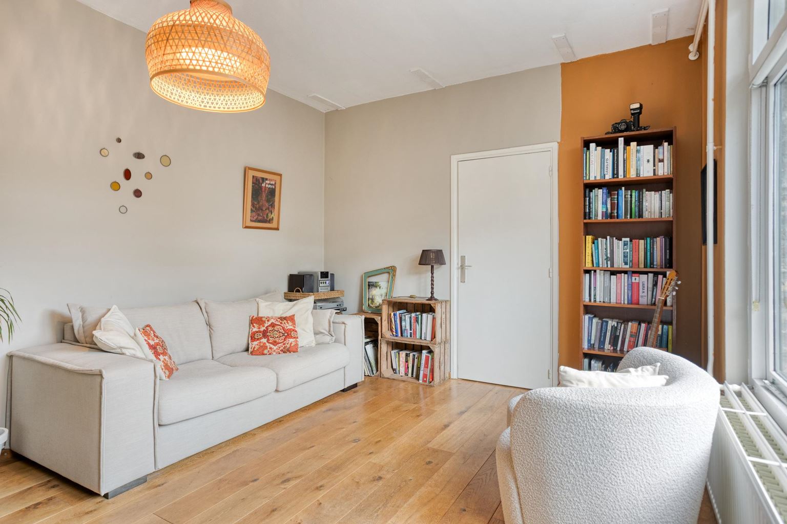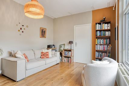 De woonkamer (17m²) is bereikbaar via de keuken en vormt het hart van het appartement. Dankzij de directe toegang tot het terras aan de zijkant vloeien binnen- en buitenruimte op prettige wijze in elkaar over. De lichtinval en de beschutte ligging zorgen hier voor een aangename woonomgeving.