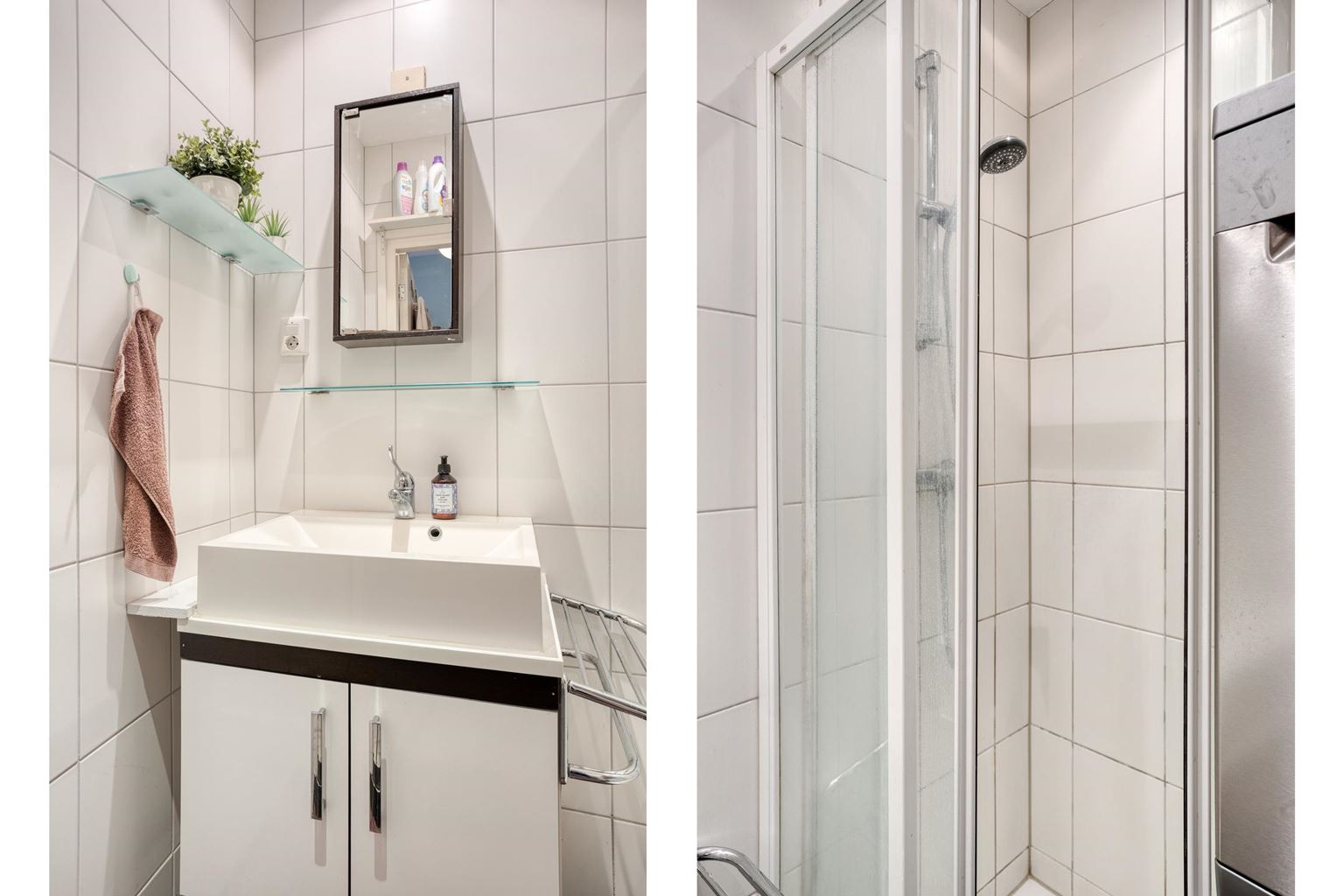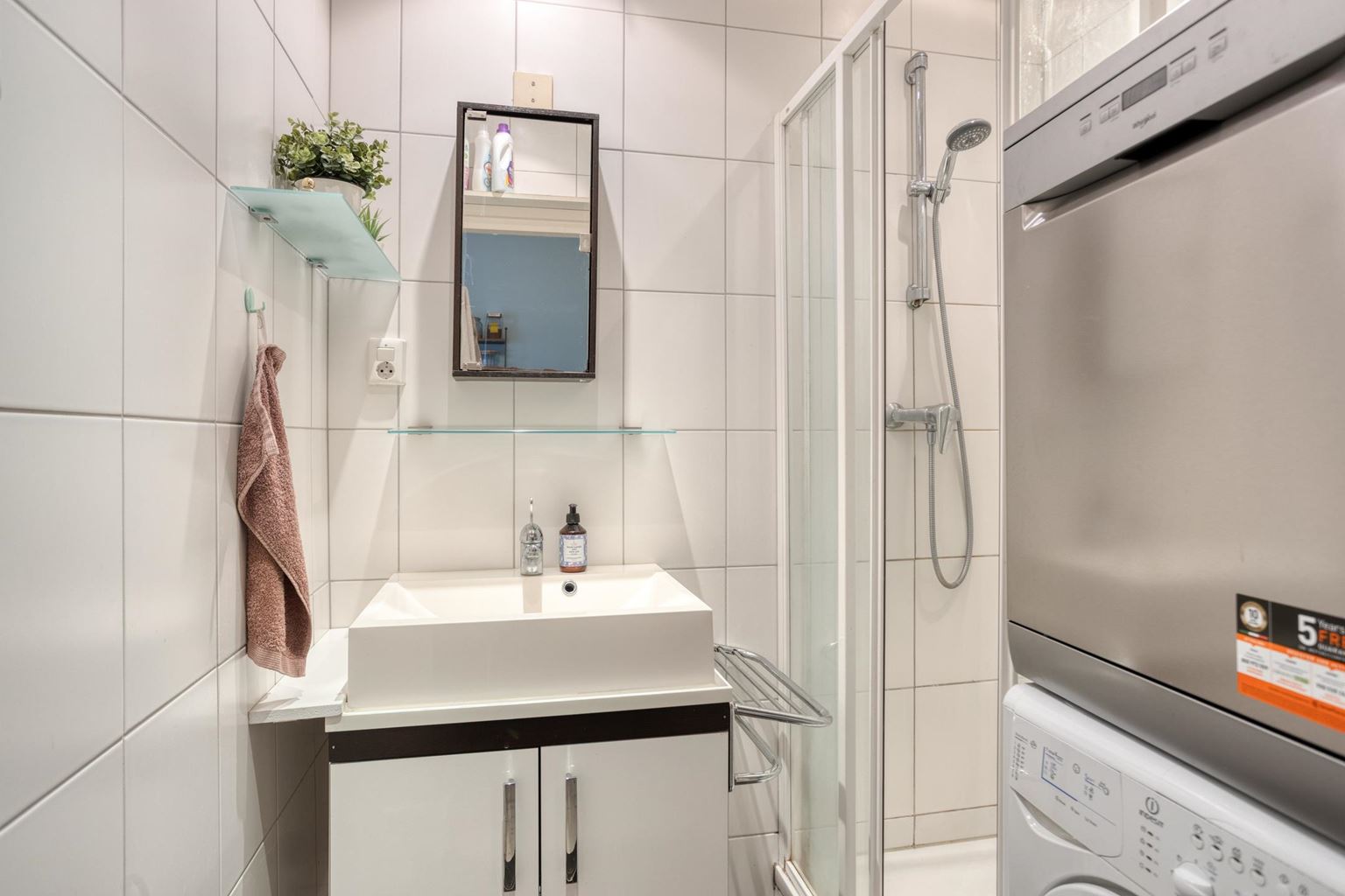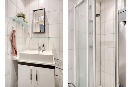 Aansluitend aan de keuken bevindt zich de badkamer (3m²). Deze is uitgerust met een douchecabine, een vaste wastafel met meubel en een aansluiting voor de wasmachine.
