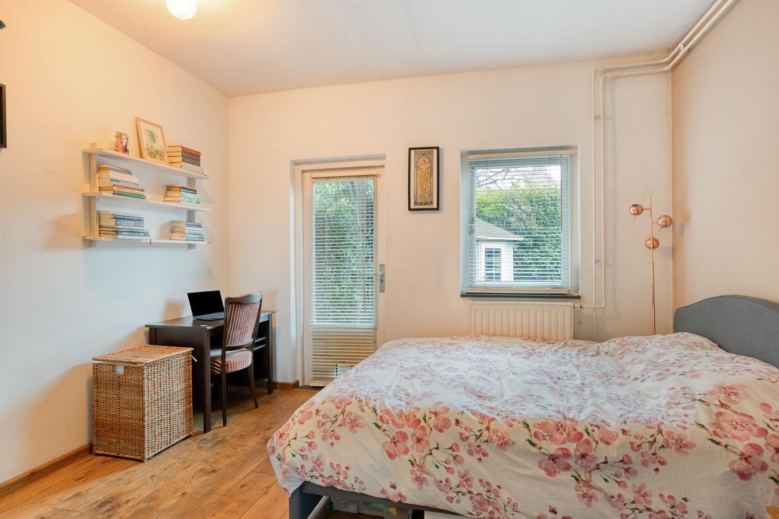 Vanuit de woonkamer bereikt u de slaapkamer (12m²), gelegen aan de rustige achterzijde van de tuin. Deze kamer biedt voldoende ruimte voor een tweepersoonsbed en kastruimte. Via de slaapkamer heeft u toegang tot het tweede terras, gesitueerd op het zuiden. Dit terras vormt een heerlijke plek om in volledige privacy te ontspannen.