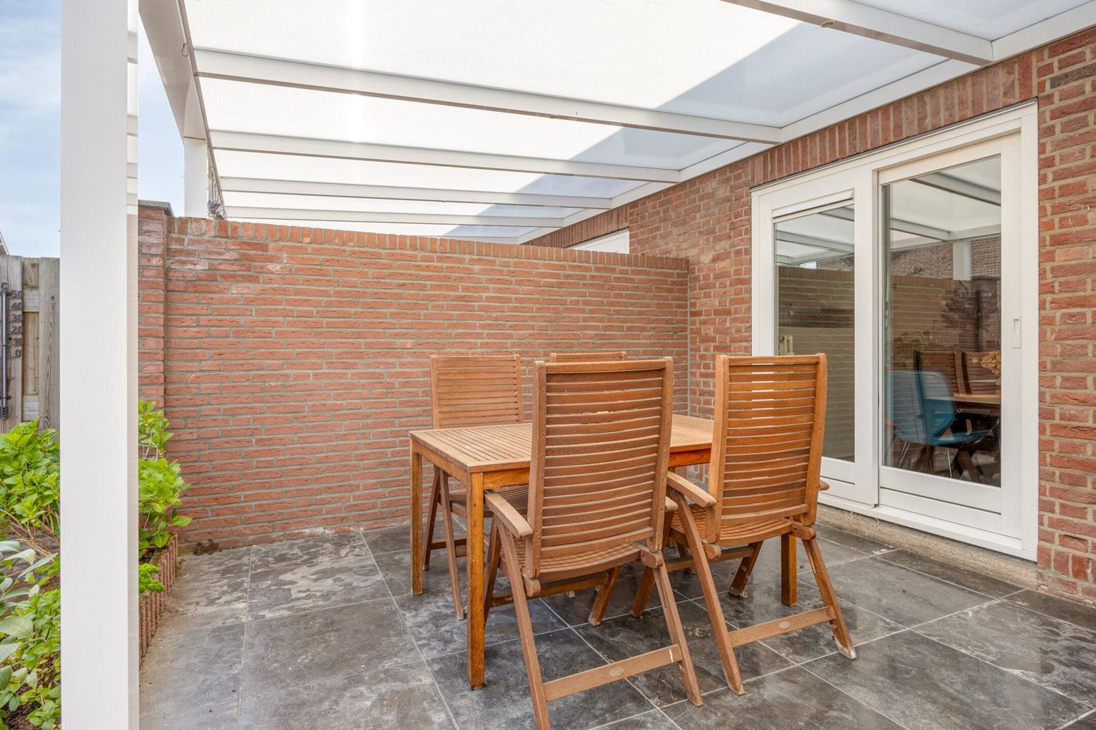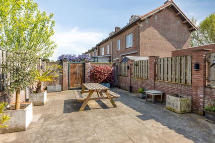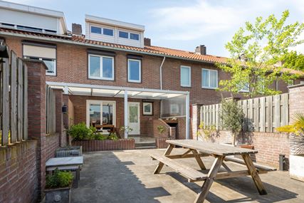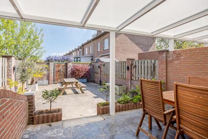 De achtertuin is verzorgd aangelegd en biedt veel privacy. Het terras met overkapping vormt een fijne plek om beschut buiten te zitten. De lager gelegen tuin is grotendeels betegeld en voorzien van elektra en verlichting. De tuin beschikt daarnaast over een achterom en biedt toegang tot het souterrain.