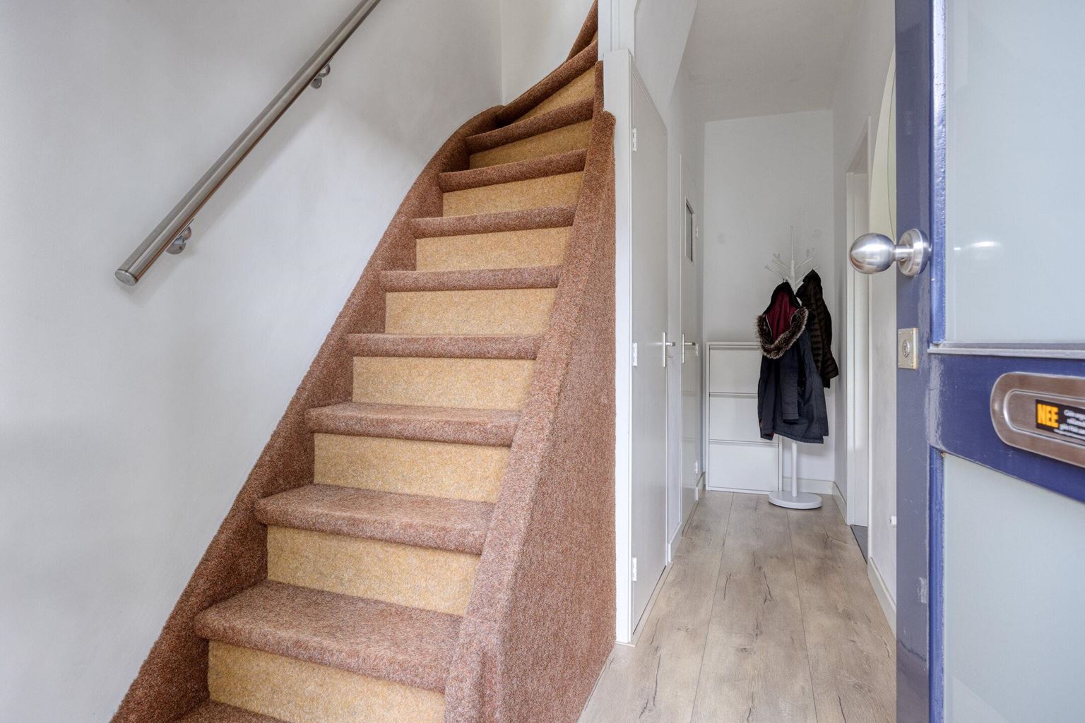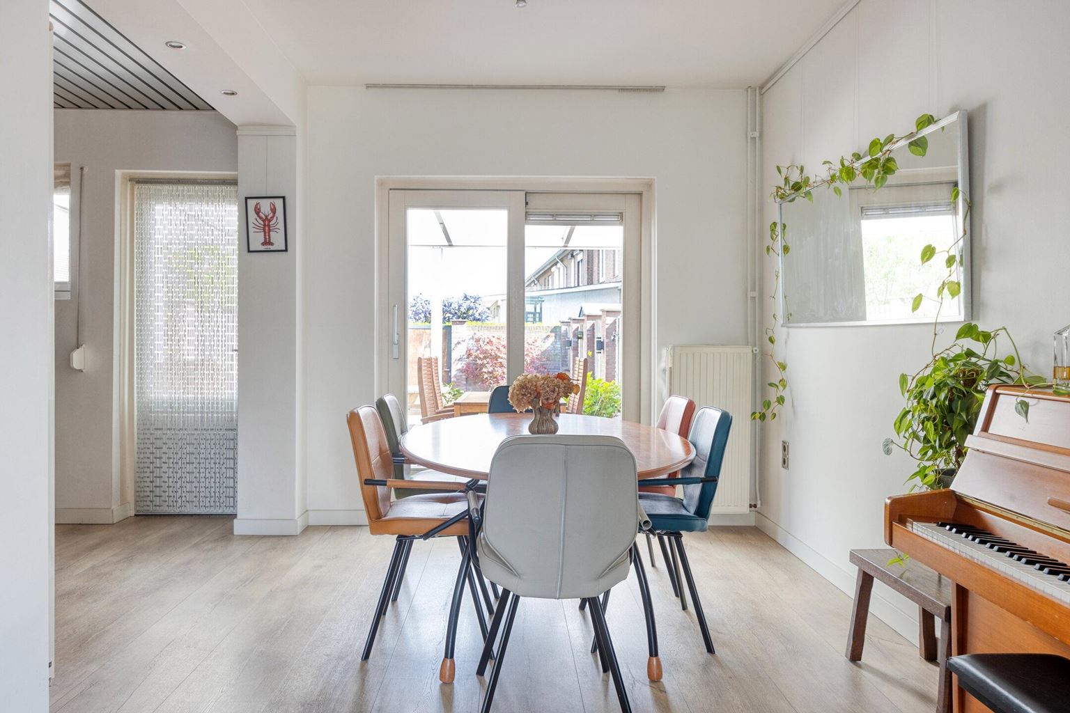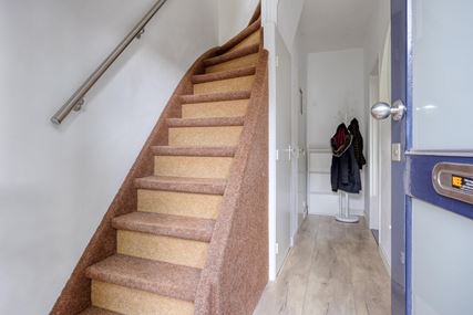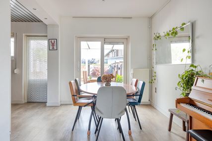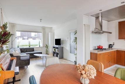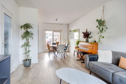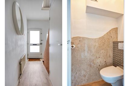 Entree/hal voorzien van een nette laminaatvloer, de meterkast en een moderne toiletruimte met wandcloset. Vanuit de hal heeft u toegang tot de kelder, eerste verdieping en de woonkamer. De ruime woonkamer (26m²) kenmerkt zich door een prettige lichtinval dankzij de grote raampartijen aan zowel de voor- als achterzijde. De laminaatvloer zorgt voor een warme uitstraling en via de schuifpui staat de woonkamer in directe verbinding met de tuin.