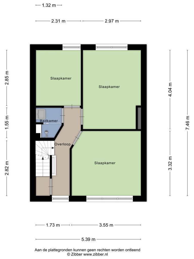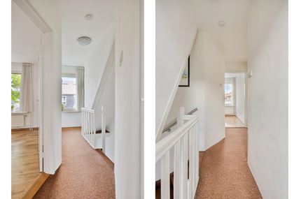 De overloop is voorzien van vloerbedekking en geniet van natuurlijke daglichttoetreding. Op deze verdieping bevinden zich drie slaapkamers, waarvan twee aan de achterzijde van de woning zijn gesitueerd met een oppervlakte van respectievelijk 12m² en 7m² en een aan de voorzijde (12m²).