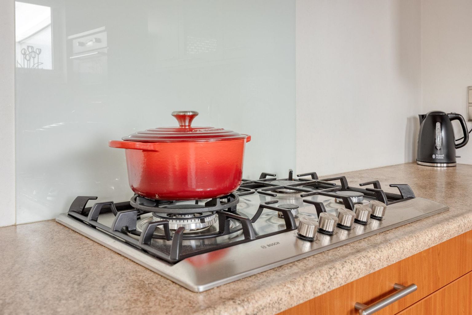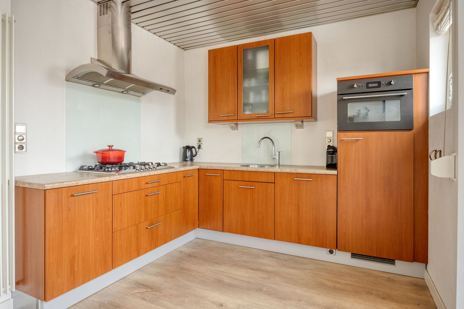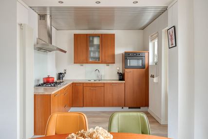 De open keuken (5m²) is opgesteld in een praktische hoekopstelling en beschikt over een kunststof werkblad en diverse inbouwapparatuur, waaronder een 5-pits gasfornuis met afzuigkap, koelkast met vriesvak, combimagnetron en een vaatwasser. Vanuit de keuken is er via een openslaande deur eveneens toegang tot de achtertuin.