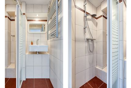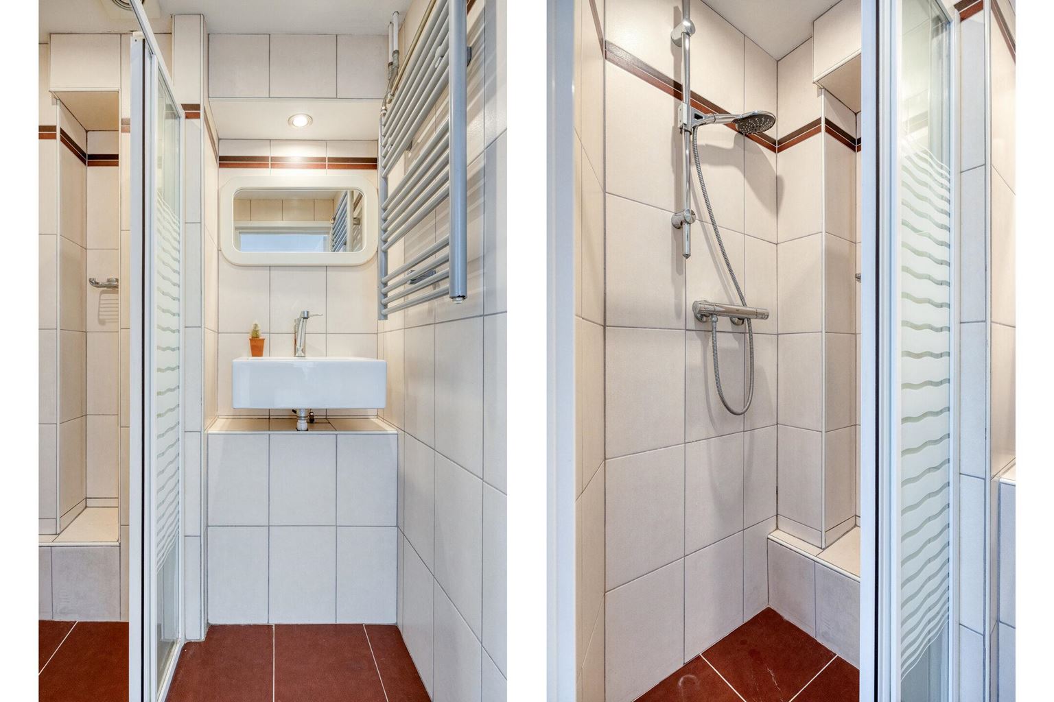De eenvoudige badkamer (2m²) is ingericht met een inloopdouche en een wastafelmeubel.