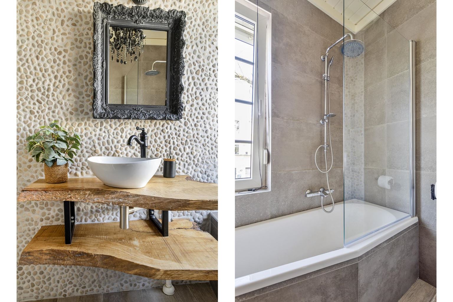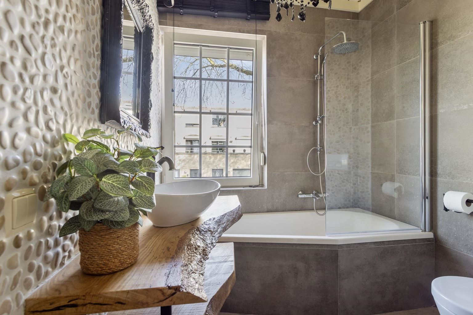 De moderne badkamer (4m²) is compleet uitgevoerd en voorzien van een ligbad met regendouche, een wandcloset en een wastafel met meubel. De ruimte is functioneel ingedeeld en biedt alles wat nodig is voor een comfortabel dagelijks gebruik.