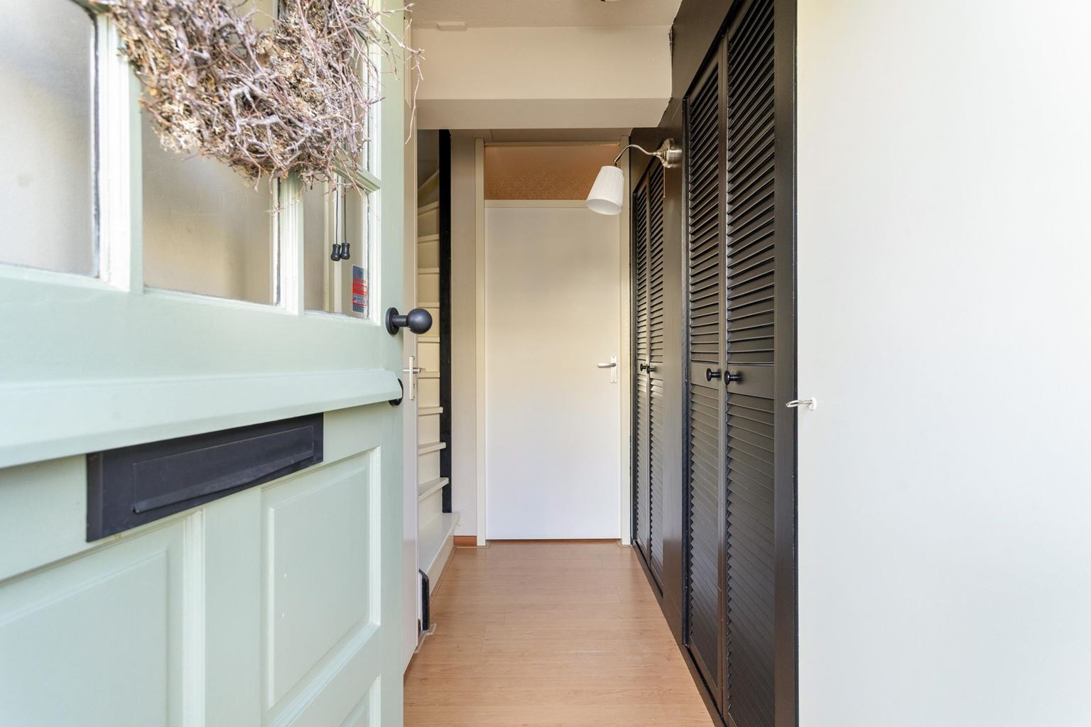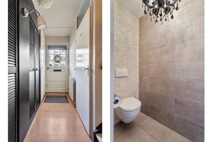 Entree/hal welke is voorzien van een nette laminaatvloer die doorloopt over de gehele begane grond en zorgt voor een uniforme en verzorgde uitstraling. In de hal bevinden zich de meterkast, een praktische garderobekast, de trapopgang naar de eerste verdieping en een moderne toiletruimte met wandcloset.