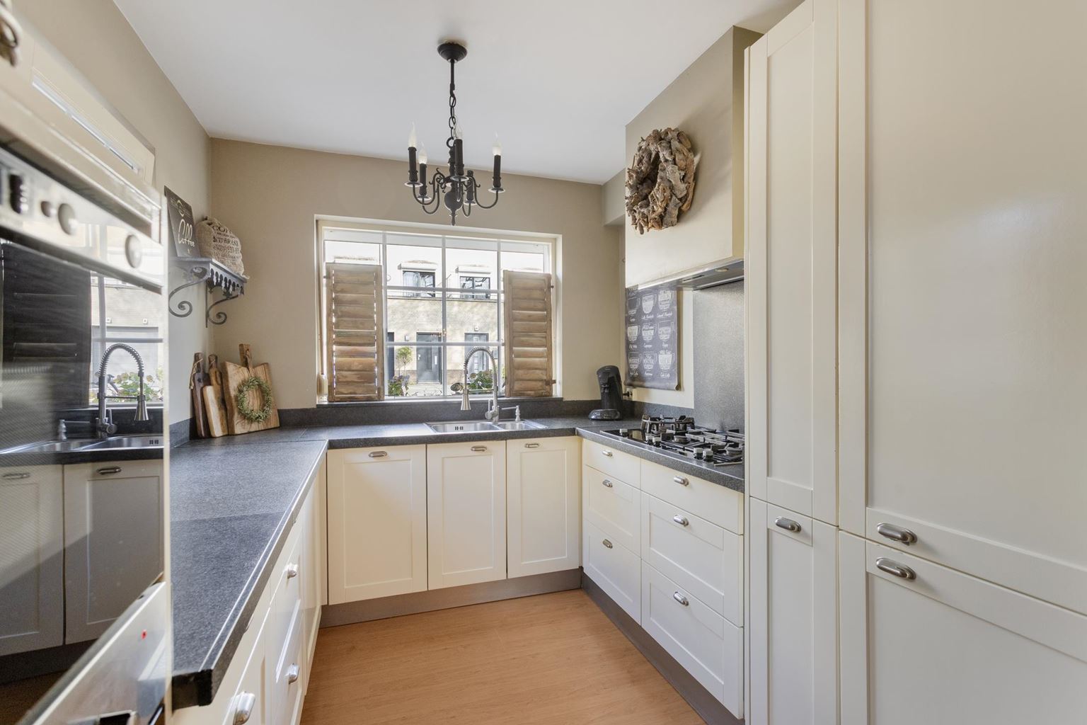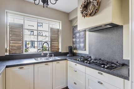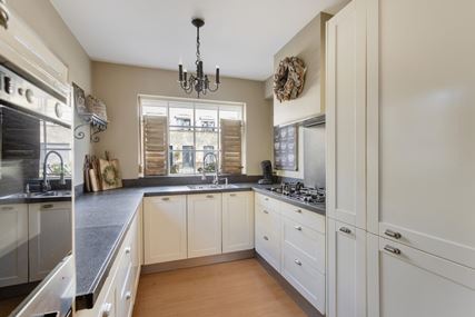 Aan de voorzijde van de woning bevindt zich de open keuken (7m²) in een praktische U-opstelling. De keuken is compleet uitgerust met diverse inbouwapparatuur, waaronder een combi-magnetron, koelkast, vriezer met drie laden, een 5-pits gasfornuis met afzuigkap, een dubbele spoelbak en een vaatwasser. De indeling biedt volop werk- en opbergruimte en is daarmee zowel functioneel als gebruiksvriendelijk.