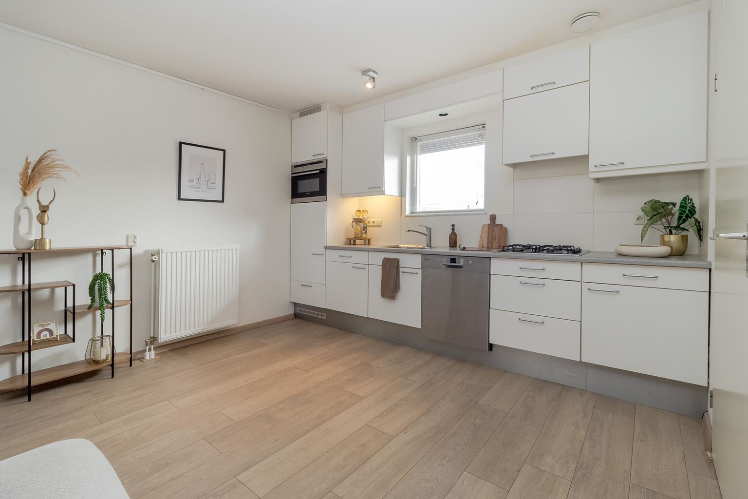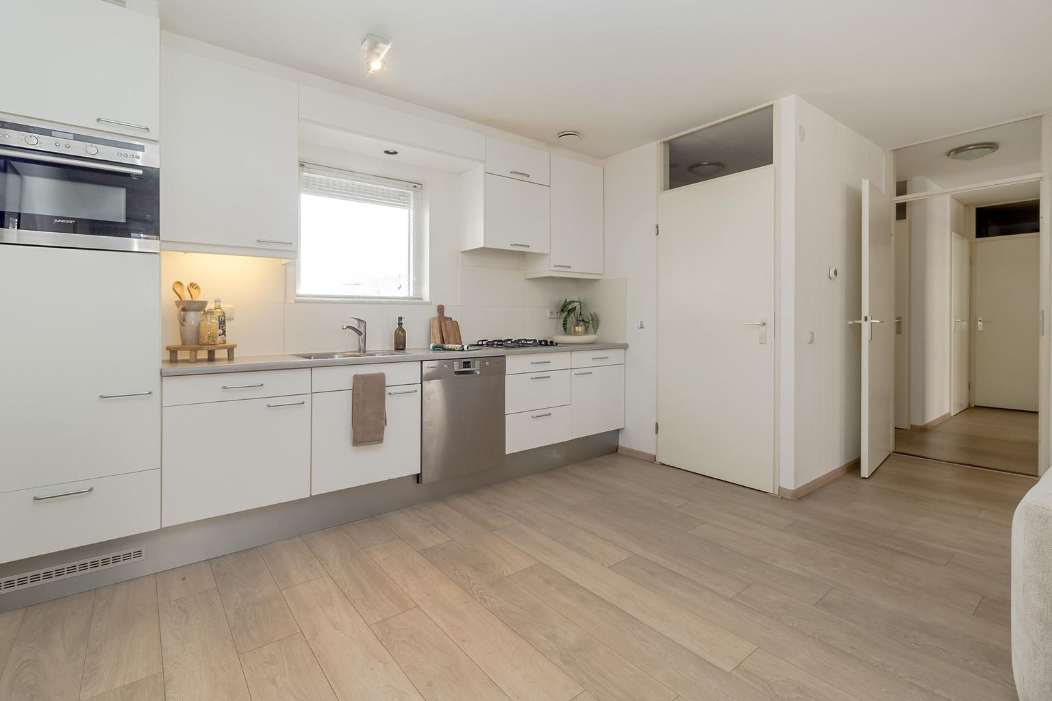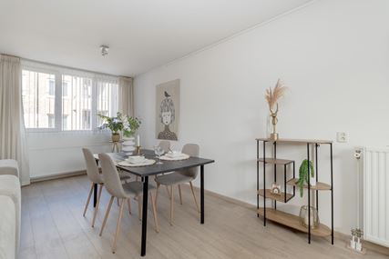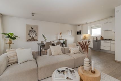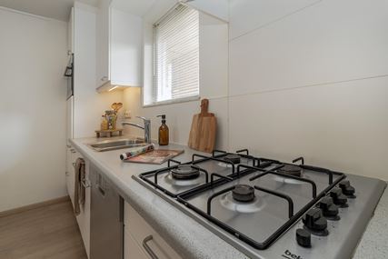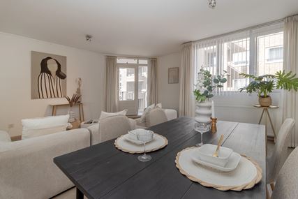 De woonkamer met open keuken vormt het hart van het appartement. Dankzij de grote raampartijen is er sprake van een prettige lichtinval en een aangename leefruimte, met voldoende plek voor zowel een comfortabele zithoek als een gezellige eethoek. De keuken is netjes uitgevoerd en voorzien van de benodigde inbouwapparatuur. Vanuit de woonkamer is er toegang tot het royale balkon, waar je in alle rust van het buitenleven kunt genieten.