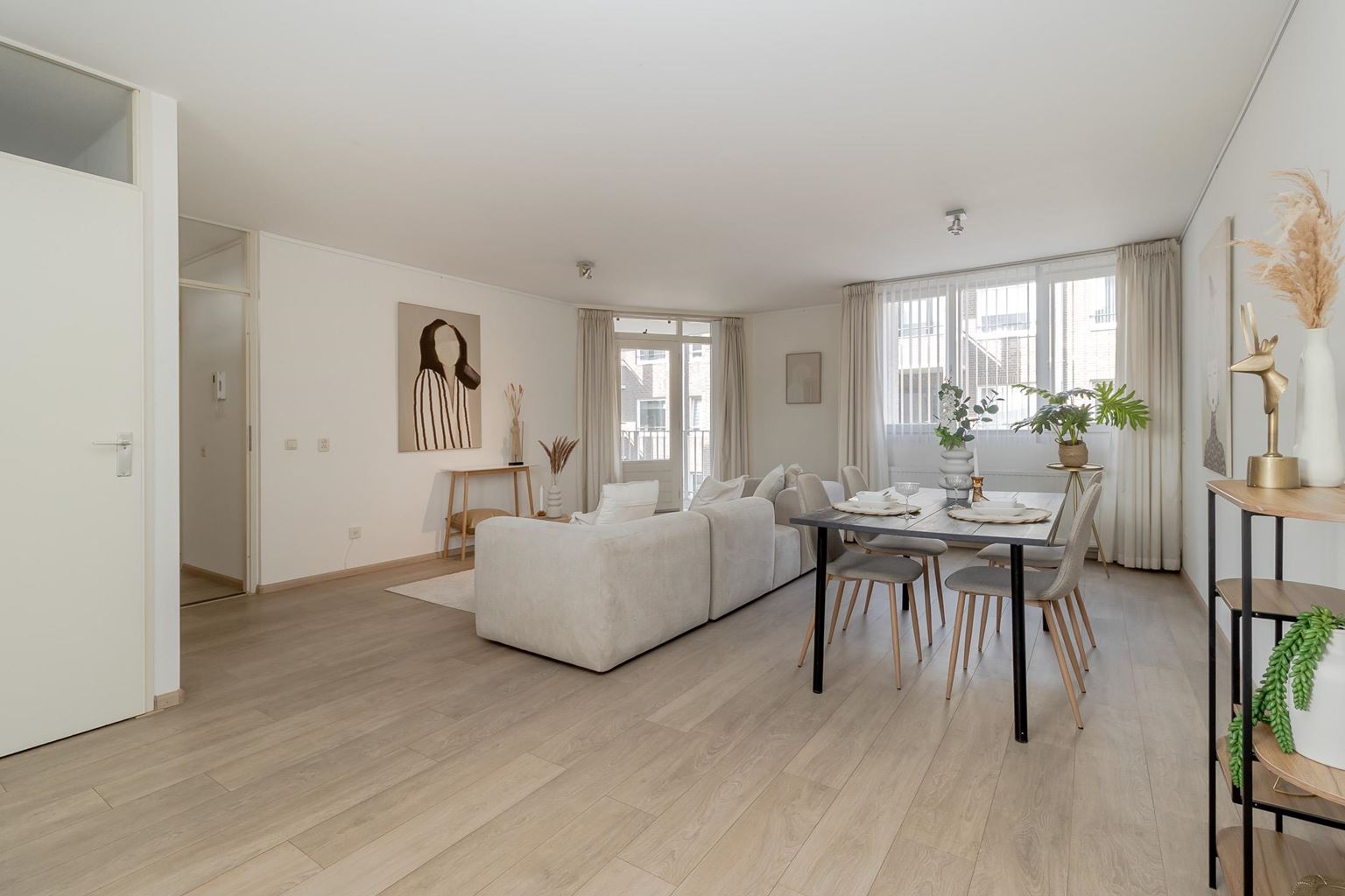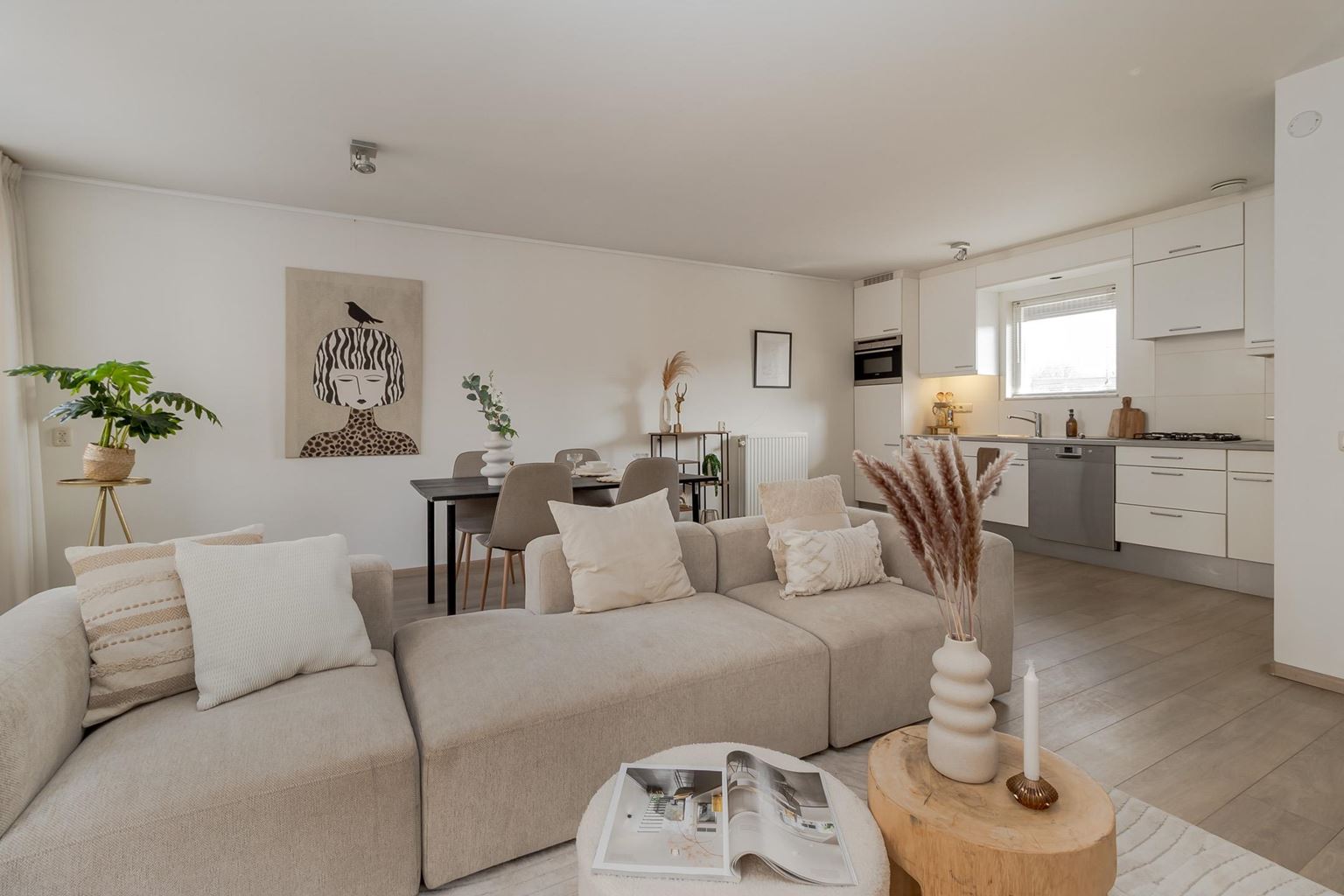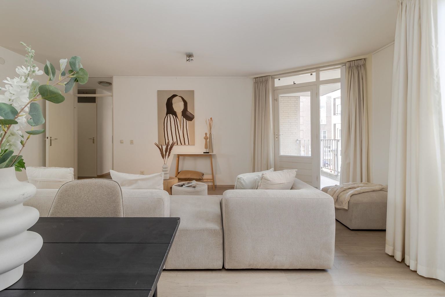 De woonkamer met open keuken vormt het hart van het appartement. Dankzij de grote raampartijen is er sprake van een prettige lichtinval en een aangename leefruimte, met voldoende plek voor zowel een comfortabele zithoek als een gezellige eethoek. De keuken is netjes uitgevoerd en voorzien van de benodigde inbouwapparatuur. Vanuit de woonkamer is er toegang tot het royale balkon, waar je in alle rust van het buitenleven kunt genieten.