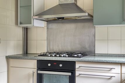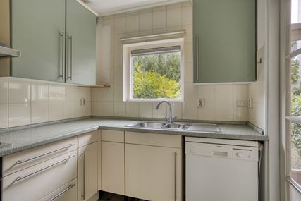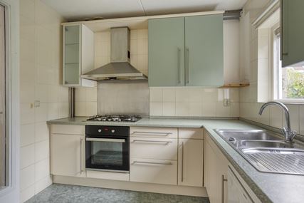 De gesloten keuken (6m²) is gelegen aan de achterzijde en uitgevoerd in een hoekopstelling. De keuken is voorzien van een kunststof werkblad en beschikt over diverse (inbouw)apparatuur, te weten: een dubbele spoelbak, vaatwasser, 5-pits gasfornuis met afzuigkap en een oven.