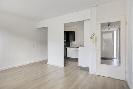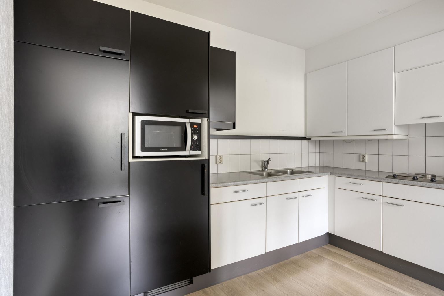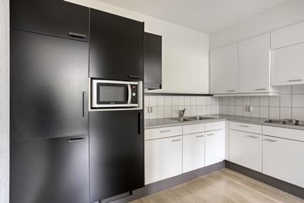 De lichte en sfeervolle woonkamer (16m²) vormt het hart van de woning. De halfopen keuken (7m²) is opgesteld in een praktische hoekopstelling en voorzien van diverse inbouwapparatuur, te weten: een 4-pits elektrische kookplaat met afzuigkap, combimagnetron, spoelbak en twee koelkasten met vriesvak.
