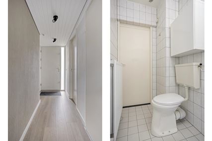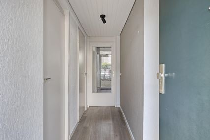 De entree geeft toegang tot een centrale hal, van waaruit alle vertrekken bereikbaar zijn. Direct aan de linkerzijde bevindt zich de eerste slaapkamer (6m²), ideaal als logeerkamer, werkplek of hobbyruimte en voorzien van een praktische op maat gemaakte kast. Aan de rechterzijde van de hal is een inpandige berging (3m²) voorzien van de aansluitpunten voor het witgoed en opstelling van de boiler. Deze ruimte biedt volop opbergmogelijkheden.