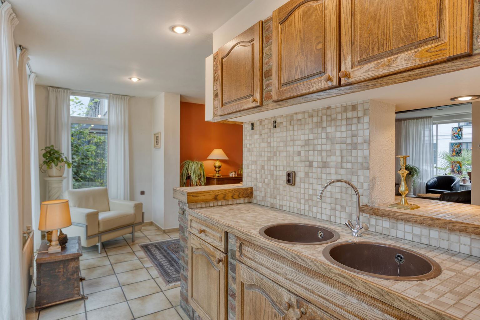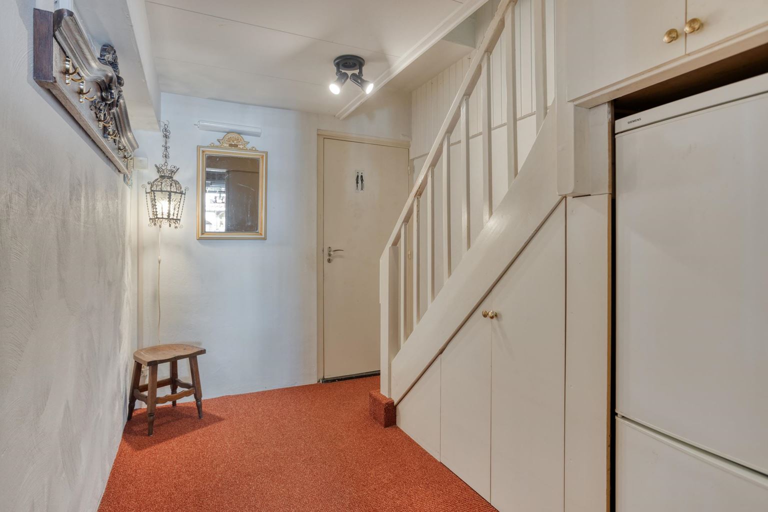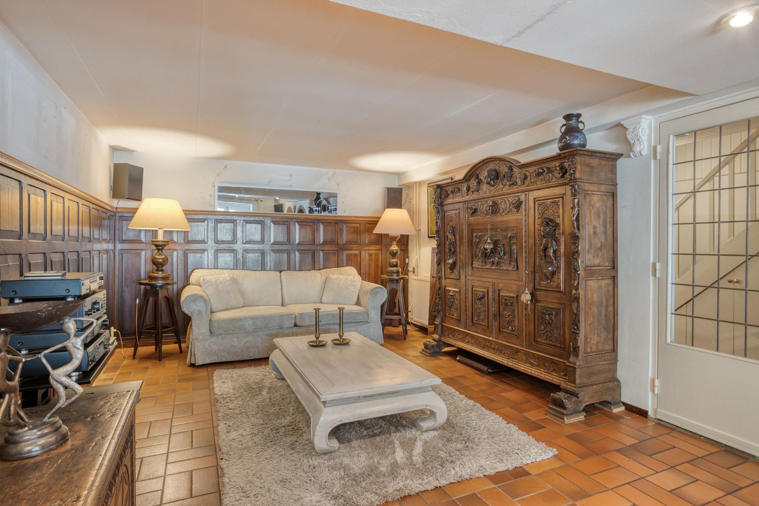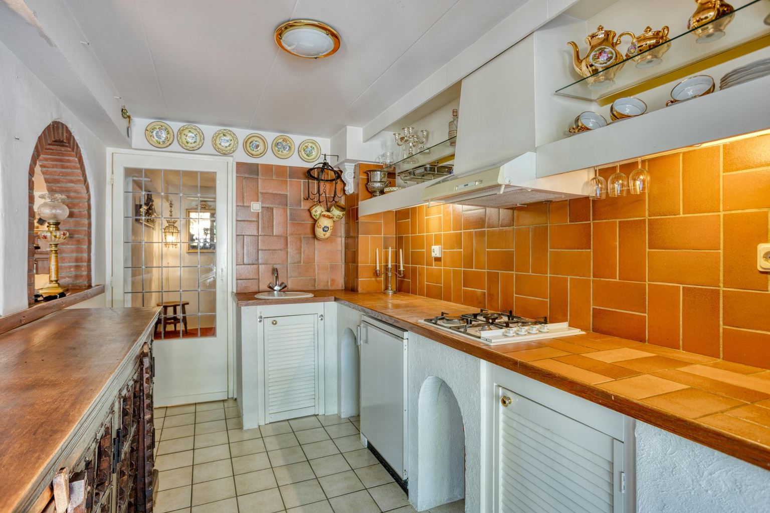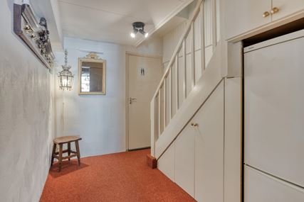 Entree/hal met tegelvloer, toilet, moderne meterkast (8 automatische groepen, 2 aardlekschakelaars en slimme meters), trapopgang en toegang tot de woonkamer en het souterrain. Het toilet is geheel betegeld en voorzien van een staand closet en een fonteintje. Ruime en sfeervolle doorzonwoonkamer met open keuken (totaal ca. 54m²), geheel voorzien van een nette tegelvloer, houten kozijnen met deels isolerende beglazing en deels rolluiken. Tevens is er een openhaard aanwezig. Bij zonnig weer is er een mooie lichtinval door de aanwezige glas-in-loodramen. De zitkamer is aan de voorzijde van de woning gelegen en de eetkamer is aan de achterzijde gesitueerd en staat in open verbinding met de keuken, welke in de aanbouw is gerealiseerd. De open keuken (ca. 12m²) is voorzien van een keukeninstallatie in hoekopstelling met boven- en onderkasten, (ontbijt)bar en de navolgende apparatuur: dubbele spoelbak, koelkast, gaskookplaat met 4 zones, oven (defect) en een afzuiginstallatie. Het geheel is keurig afgewerkt met een houten werkblad met tegeltjes + boiler voor de warmwatervoorziening. Vanuit de keuken is er een fantastisch uitzicht op de Spaanse achtertuin. Zowel de keuken als ook de woonkamer genieten veel lichtinval vanwege de grote ramenpartijen.
