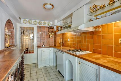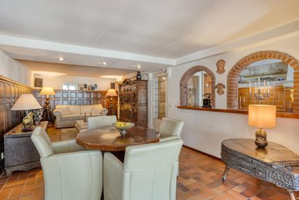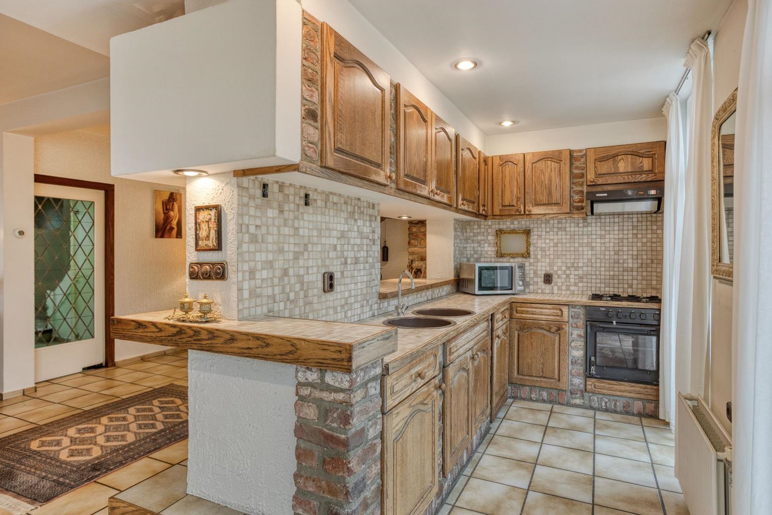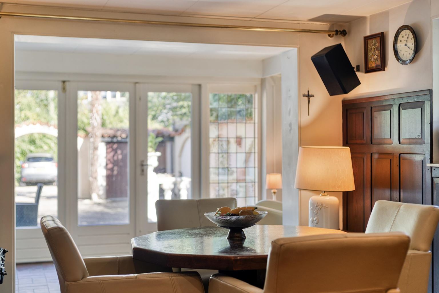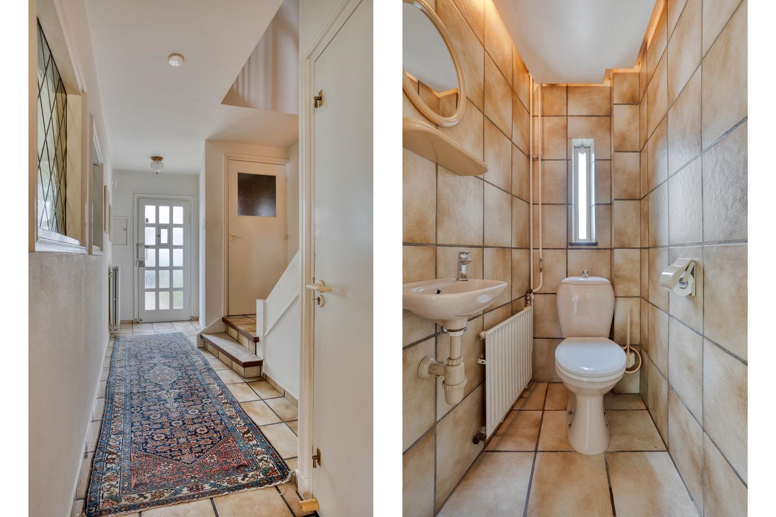 Entree/hal met tegelvloer, toilet, moderne meterkast (8 automatische groepen, 2 aardlekschakelaars en slimme meters), trapopgang en toegang tot de woonkamer en het souterrain. Het toilet is geheel betegeld en voorzien van een staand closet en een fonteintje. Ruime en sfeervolle doorzonwoonkamer met open keuken (totaal ca. 54m²), geheel voorzien van een nette tegelvloer, houten kozijnen met deels isolerende beglazing en deels rolluiken. Tevens is er een openhaard aanwezig. Bij zonnig weer is er een mooie lichtinval door de aanwezige glas-in-loodramen. De zitkamer is aan de voorzijde van de woning gelegen en de eetkamer is aan de achterzijde gesitueerd en staat in open verbinding met de keuken, welke in de aanbouw is gerealiseerd. De open keuken (ca. 12m²) is voorzien van een keukeninstallatie in hoekopstelling met boven- en onderkasten, (ontbijt)bar en de navolgende apparatuur: dubbele spoelbak, koelkast, gaskookplaat met 4 zones, oven (defect) en een afzuiginstallatie. Het geheel is keurig afgewerkt met een houten werkblad met tegeltjes + boiler voor de warmwatervoorziening. Vanuit de keuken is er een fantastisch uitzicht op de Spaanse achtertuin. Zowel de keuken als ook de woonkamer genieten veel lichtinval vanwege de grote ramenpartijen.