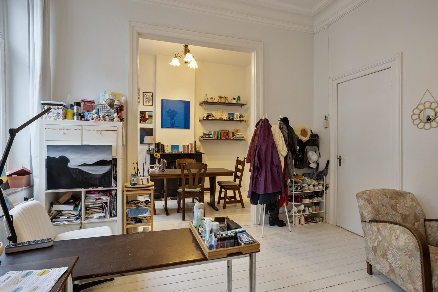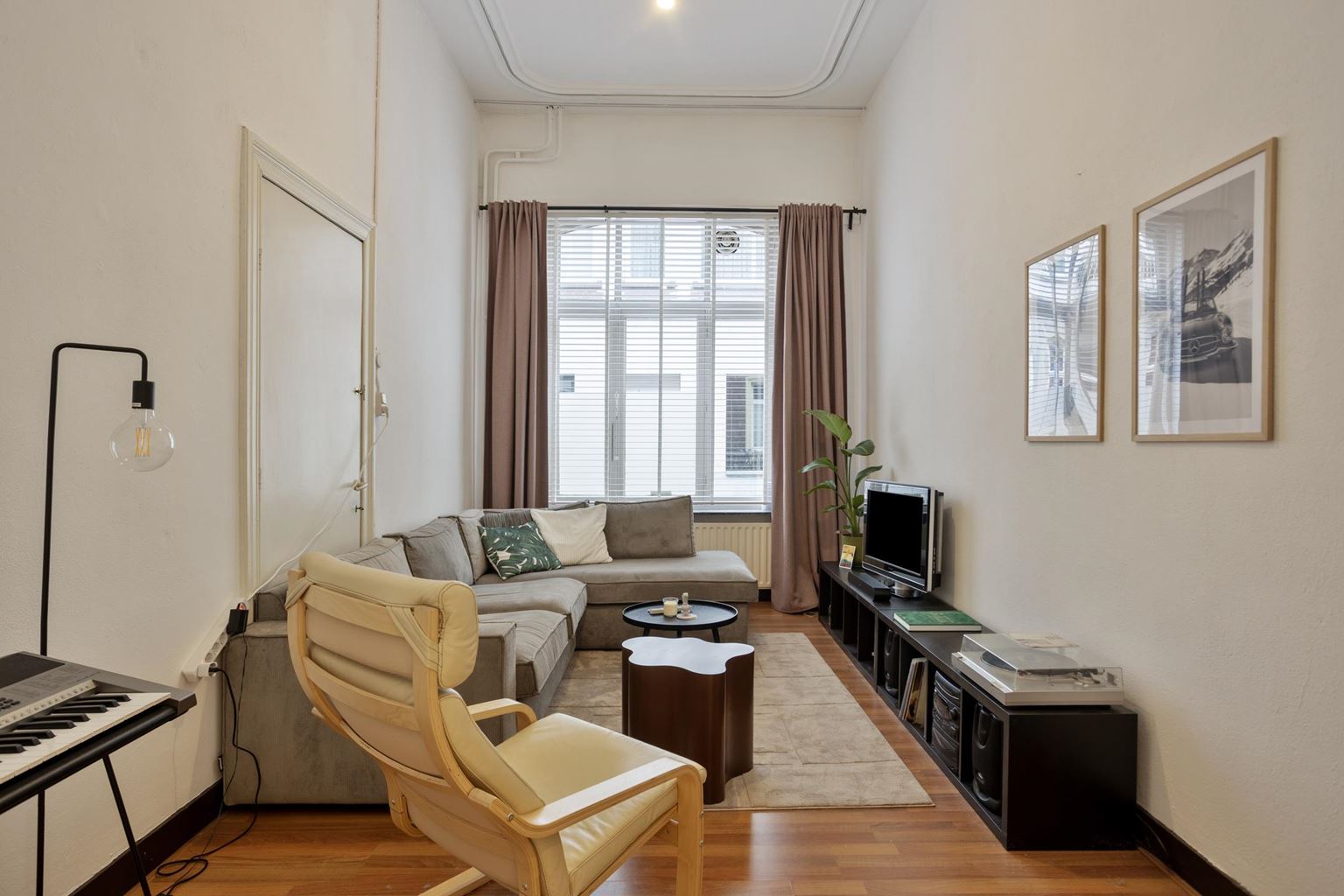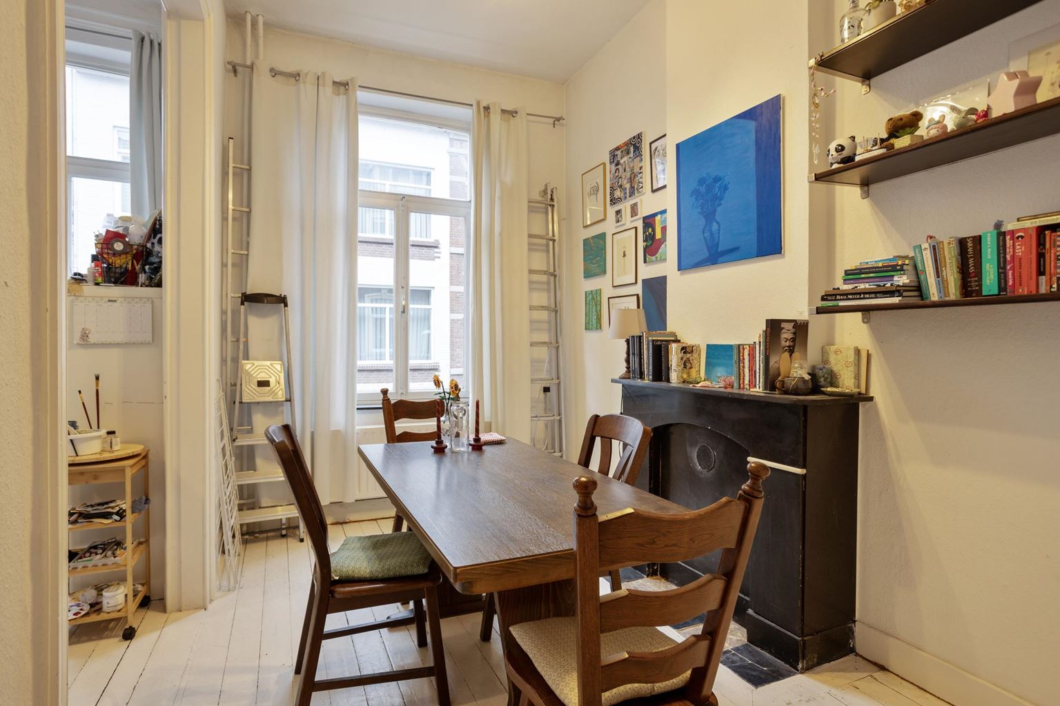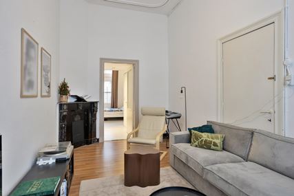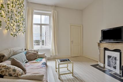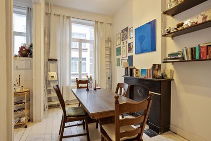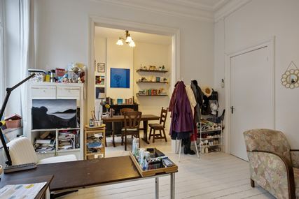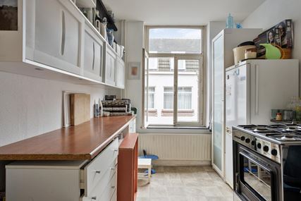 Het appartement op de tweede verdieping is eveneens bereikbaar via de gemeenschappelijke overloop en beschikt over een woonkamer, een aparte keuken met gescheiden eetkamer, een slaapkamer en een badkamer.